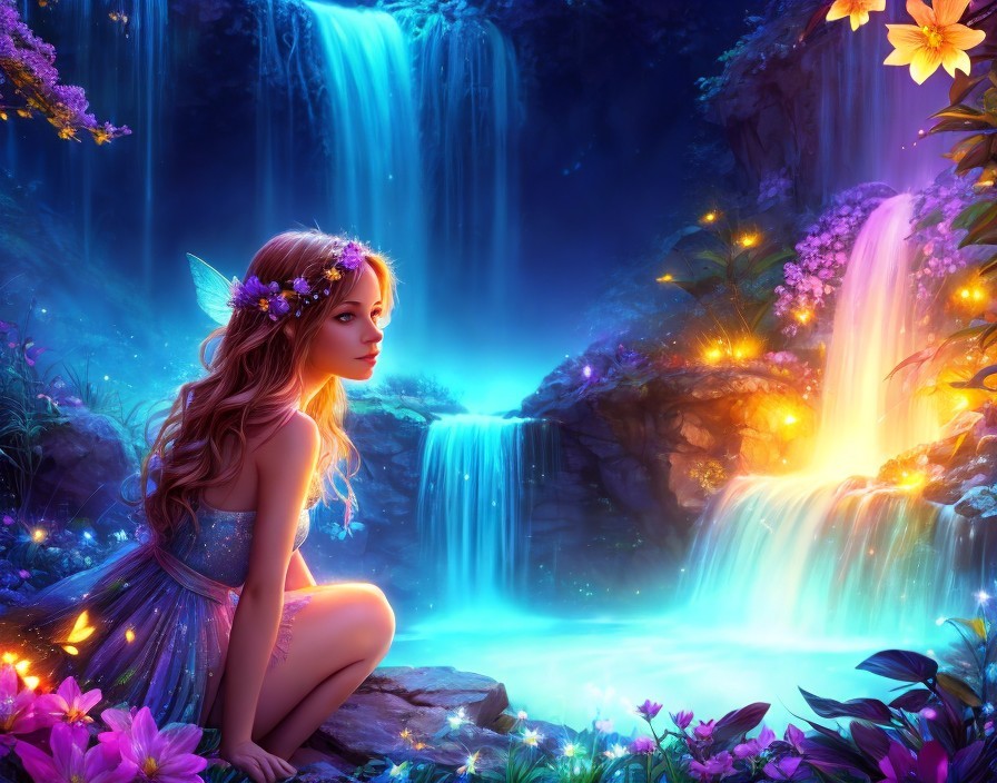 Woman in fantasy setting with waterfall and glowing lights among colorful plants