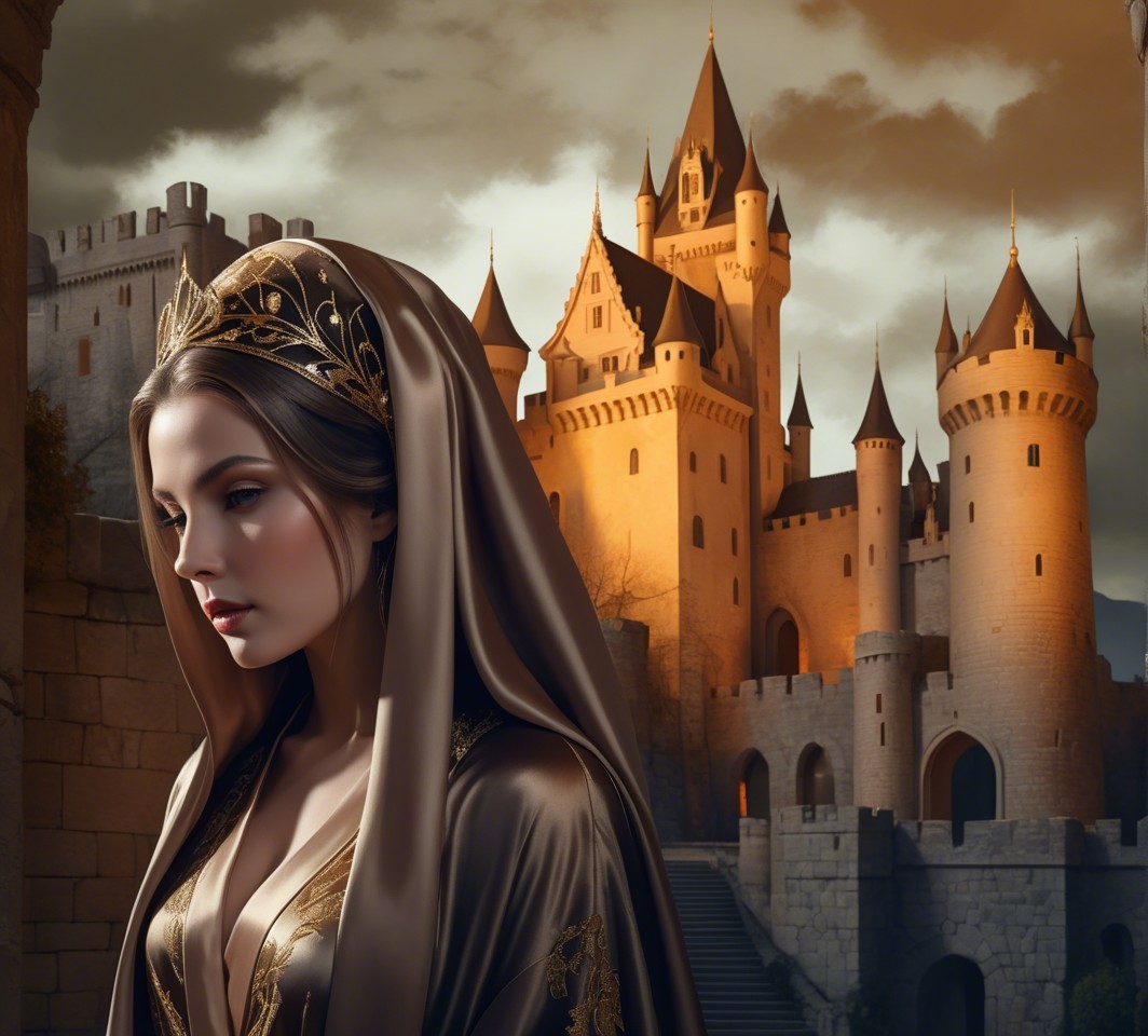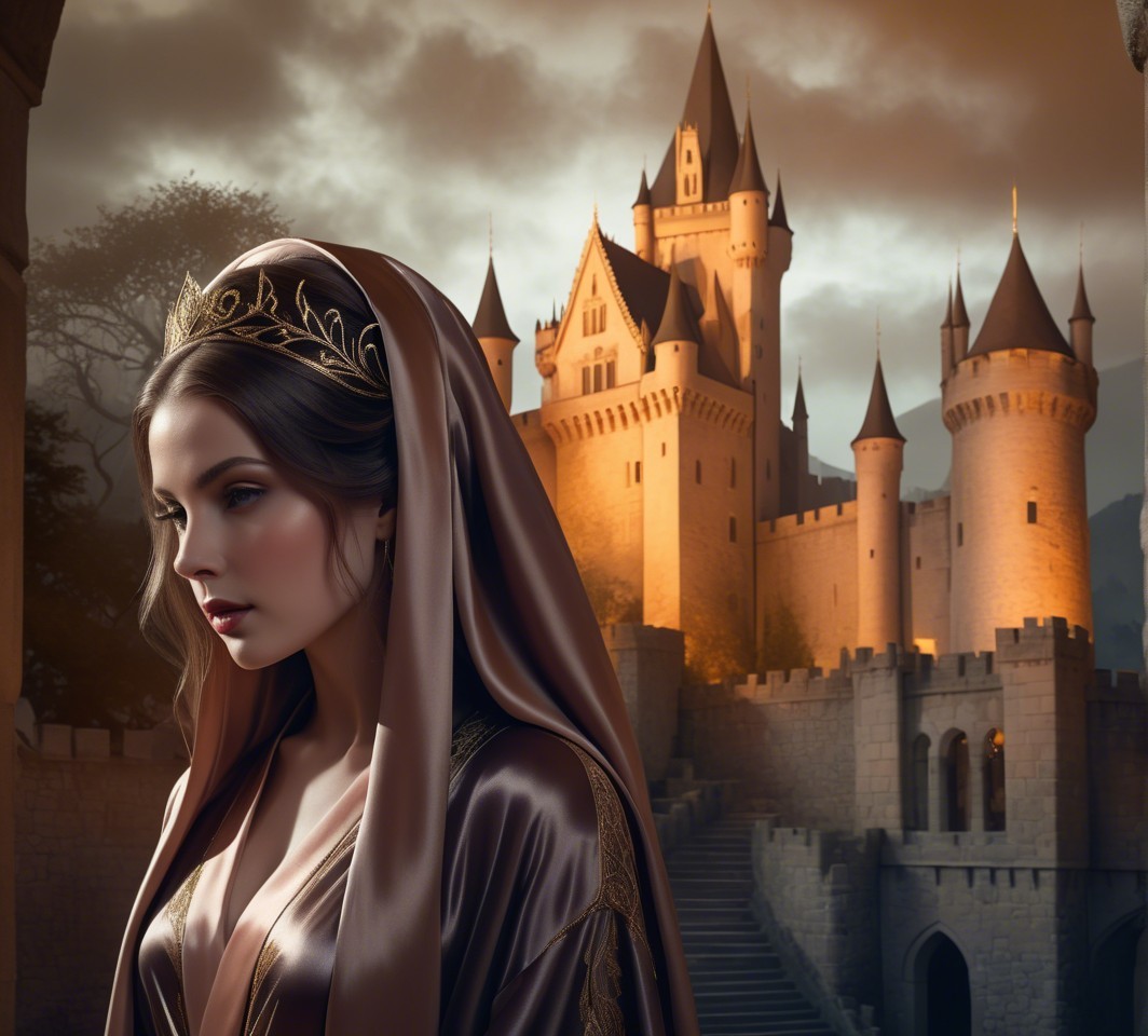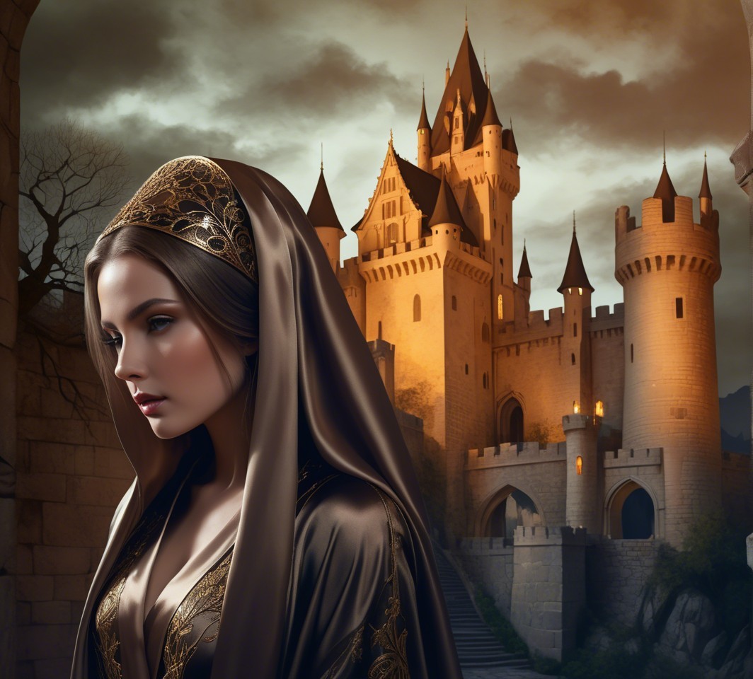 Prompt: Enigmatic enchantress draped in a satin robe, standing before a shadowy castle, features slightly exaggerated. Filigree branches surround her in a cel-shaded world. Warm subtle tones illuminate her, revealing complex shapes with intricate lines in ultra HD resolution. Soft dappled lighting creates a foggy, textured watercolor effect, while a triadic color scheme of beige, umbra, and ochre sets the tone. The scene exudes luminism, with a touch of the Harlem Renaissance movement, merging with pop art style. The image boasts a fusion of abstract and expressive lighting, reflecting a dethereal atmosphere. Every detail, from perfect hands to face, is meticulously crafted in synthetic perfection. The wide-angle view captures the essence of modern fantasy art, with detailed features and captivating lighting. Vintage nuances blend seamlessly with acrylic details, creating an introverted aura against a backdrop of historical architectural elements in sepia tones. Medieval ambiance is enhanced by a wide-angle perspective, immersed in dark Gothic fantasy art. Soft eroticism subtly weaves through the composition, guided by Overton Loyd's color palette. VFX-inspired depth of field and chiaroscuro effects add cinematic flair, while rim lighting enhances the drama. Mixed media techniques bring earthy tones to life, with detailed gelsculpt 64K capturing every nuance. Novelty architecture elements intertwine with warm color tones, creating a mesmerizing tapestry of textures. Opal and Thoris' fantasy art influences, along with soft earth tones, darkened sky, nuanced painterly effect