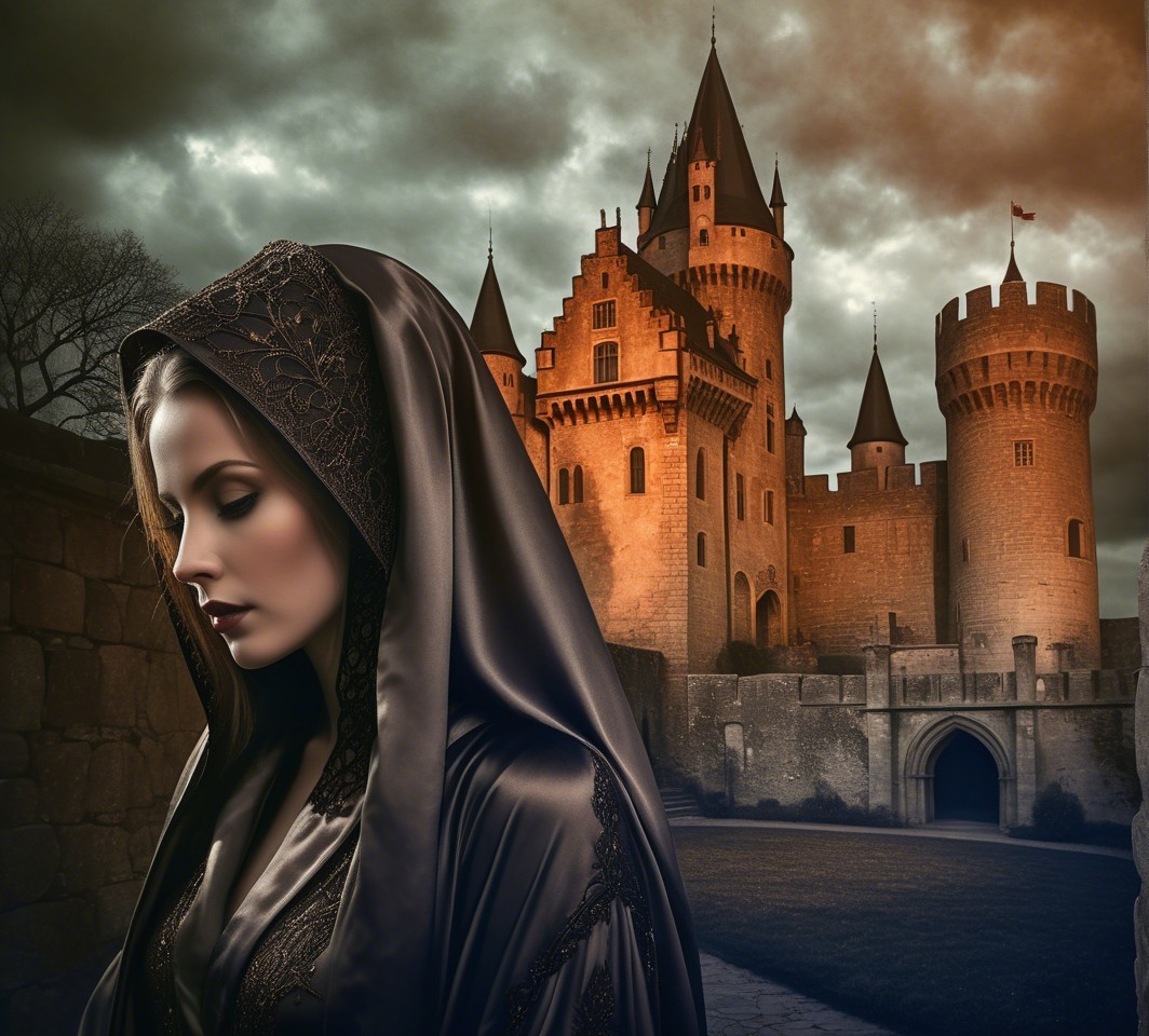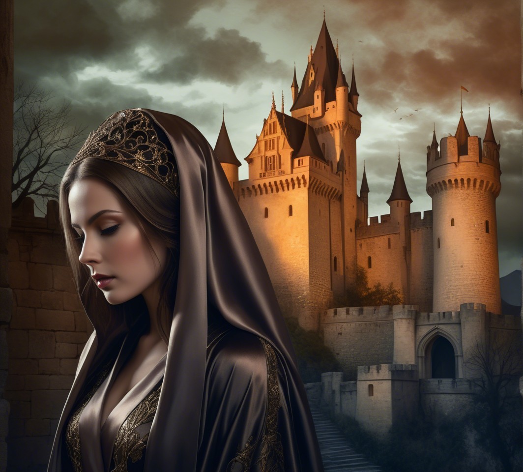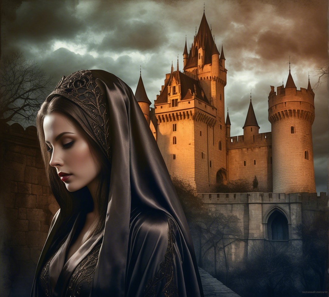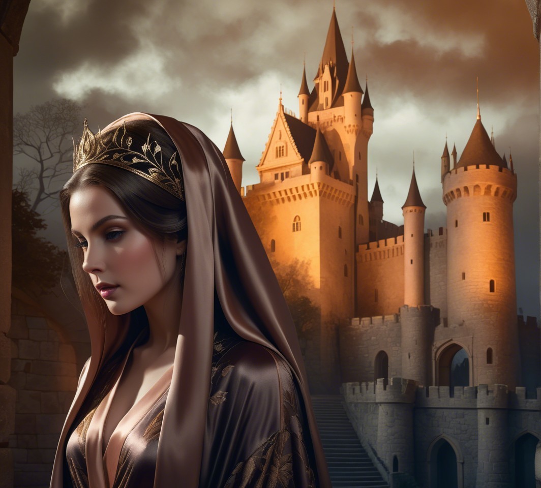 Prompt: Enigmatic enchantress draped in a satin robe, standing before a shadowy castle, features slightly exaggerated. Filigree branches surround her in a cel-shaded world. Warm subtle tones illuminate her, revealing complex shapes with intricate lines in ultra HD resolution. Soft dappled lighting creates a foggy, textured watercolor effect, while a triadic color scheme of beige, umbra, and ochre sets the tone. The scene exudes luminism, with a touch of the Harlem Renaissance movement, merging with pop art style. The image boasts a fusion of abstract and expressive lighting, reflecting a dethereal atmosphere. Every detail, from perfect hands to face, is meticulously crafted in synthetic perfection. The wide-angle view captures the essence of modern fantasy art, with detailed features and captivating lighting. Vintage nuances blend seamlessly with acrylic details, creating an introverted aura against a backdrop of historical architectural elements in sepia tones. Medieval ambiance is enhanced by a wide-angle perspective, immersed in dark Gothic fantasy art. Soft eroticism subtly weaves through the composition, guided by Overton Loyd's color palette. VFX-inspired depth of field and chiaroscuro effects add cinematic flair, while rim lighting enhances the drama. Mixed media techniques bring earthy tones to life, with detailed gelsculpt 64K capturing every nuance. Novelty architecture elements intertwine with warm color tones, creating a mesmerizing tapestry of textures. Opal and Thoris' fantasy art influences, along with soft earth tones, darkened sky, nuanced painterly effect