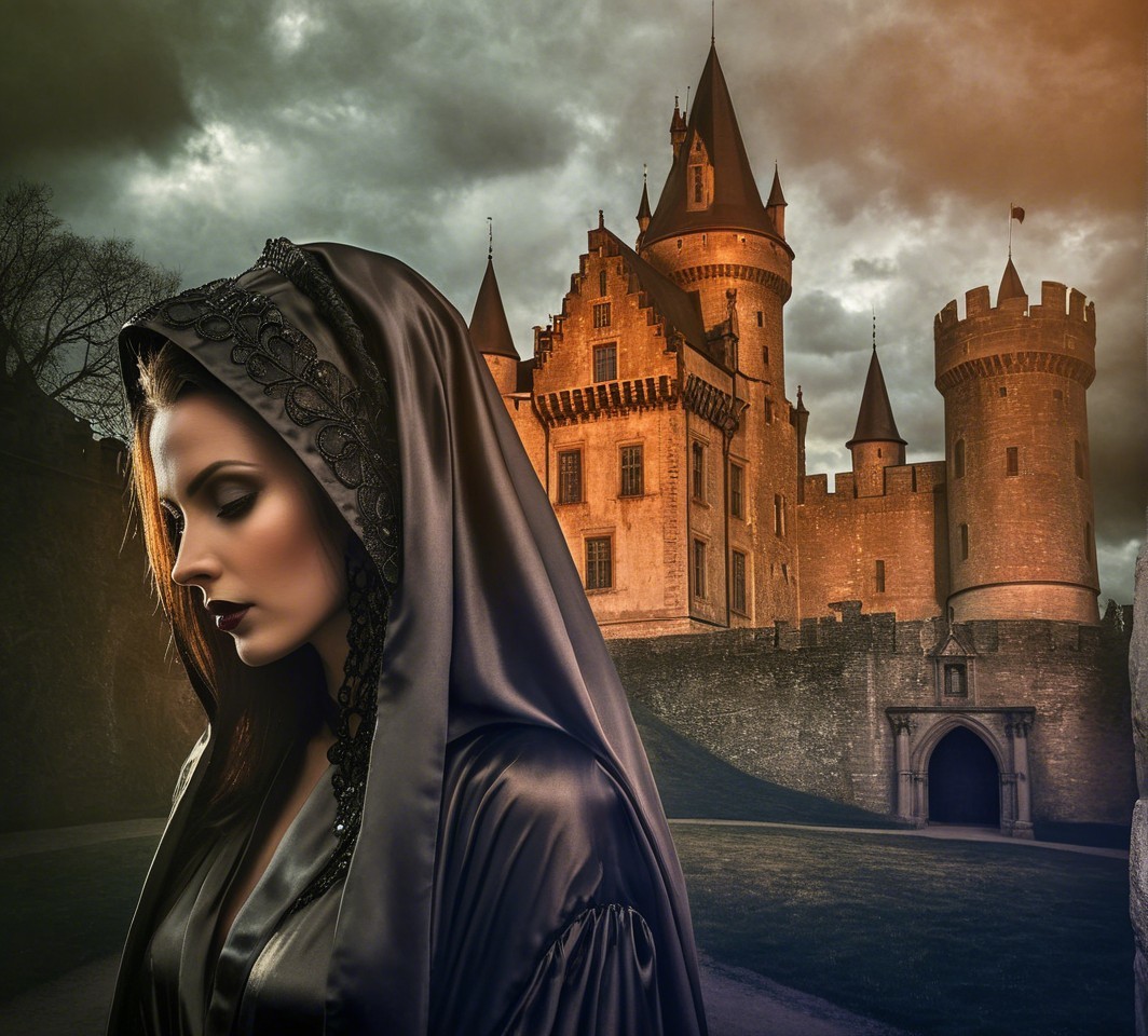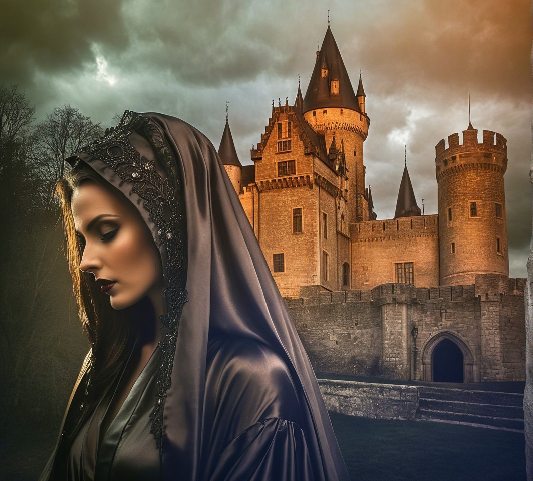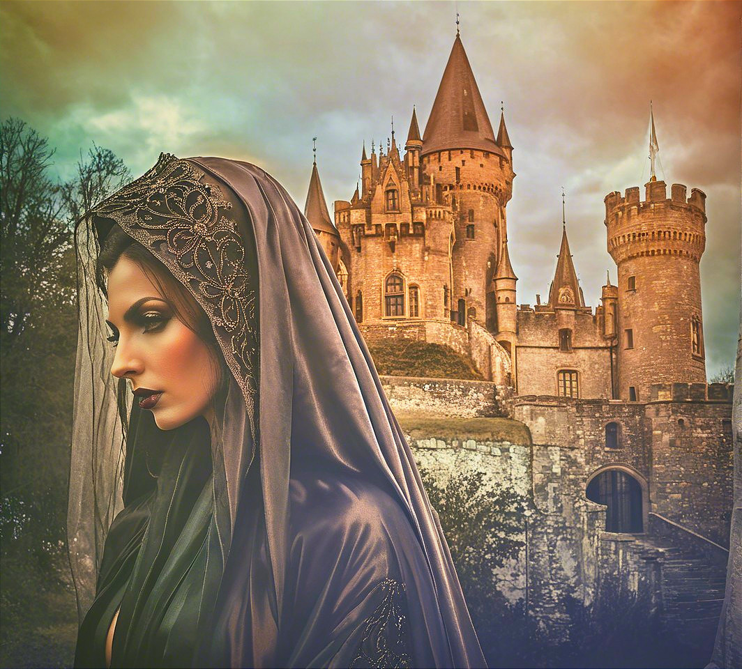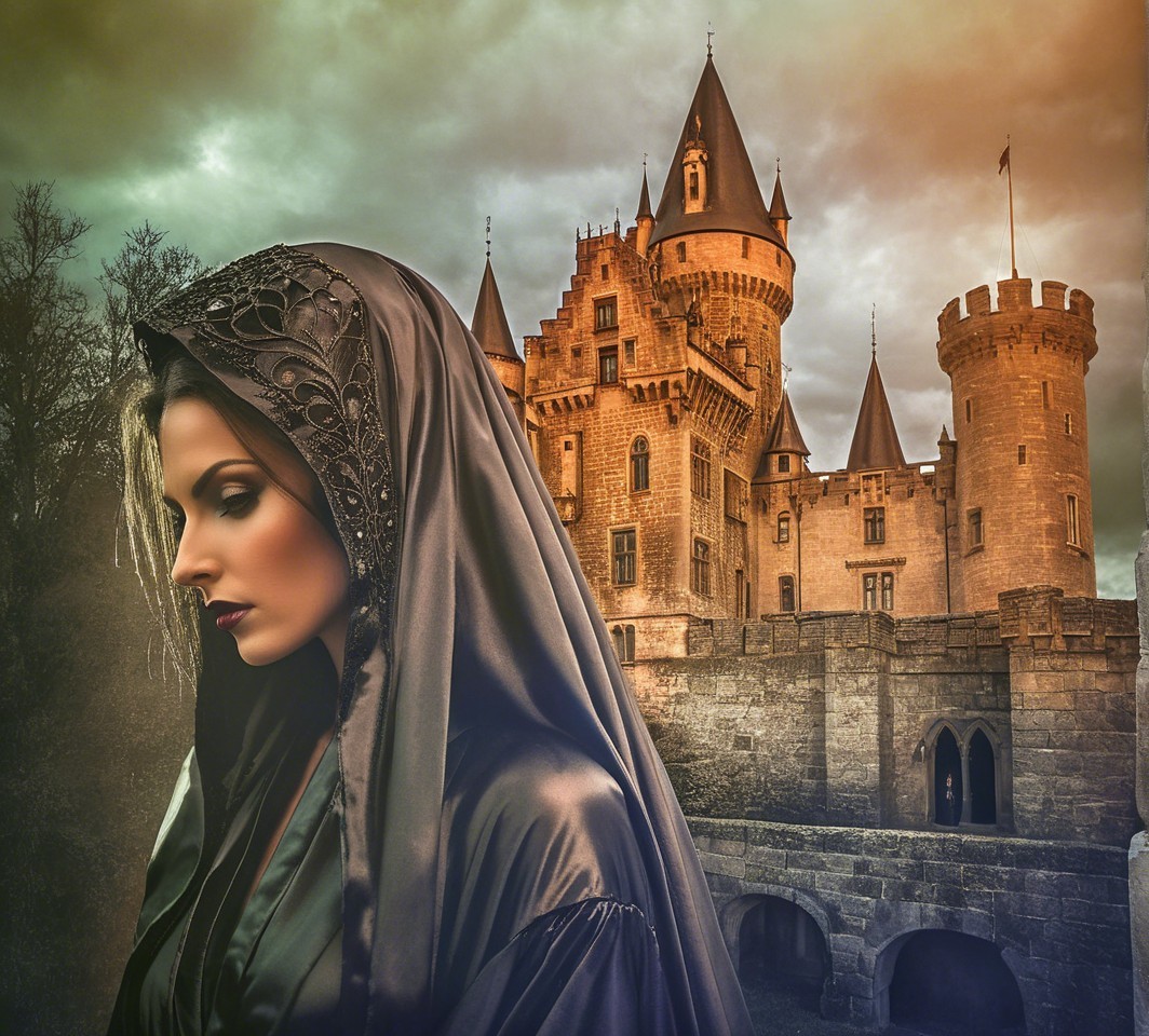 + Prompt:Multi-layered, multi-textured, multidimensional upper body portrait of Enchantress in front of shadowy castle with satin robe, dark sky, dark fantasy art, vintage details, historical architecture, medieval ambiance, sepia tones in hues, wide angle, dark Gothical fantasy art, eroticism, hues by Overton Loyd, blotting textures, dewy, mosscore. concept art, photography, realistic, VFX, concept art, artstation, deviantart, depth of field, Intricate trees with filigree branches. full moon illuminates the scene, casting an dark Gothical otherworldly glow. Rim lighting, parallax occlusion 1.5, cinematic lighting, Mixed Media, great depth and scale, earth tones, ochre tones, squiggly precision by Overton Loyd,textured pointillism, brushed paint and ink style, luminosity 1.3, radiance, divisionism, tonalism, fantasy art inspired by arlie Opal and Dejah Thoris, contouring outlines by Frank Fazetta, cottagegore 1.2, Natural details, uplifting, plasticity 1.3, sculpted, baroque, foampunk 1.9, concept art, parallax occlusion 1.2, shadow mapping 1.1, squiggly, stacked lines, abstract, coherent, otherworldly, octane render illustration 1.5, intricate coloring 1.9, saturated colors, brightness 1.9, gothical, wide angle, ultra detailed, tall and lean details, seamless, anisotropic filtering 1.2,luminosity 1.9, brightness 1.9, triadic color scheme beige sea-green, black,overall composition by Frank Fazetta and Brad Kunkle