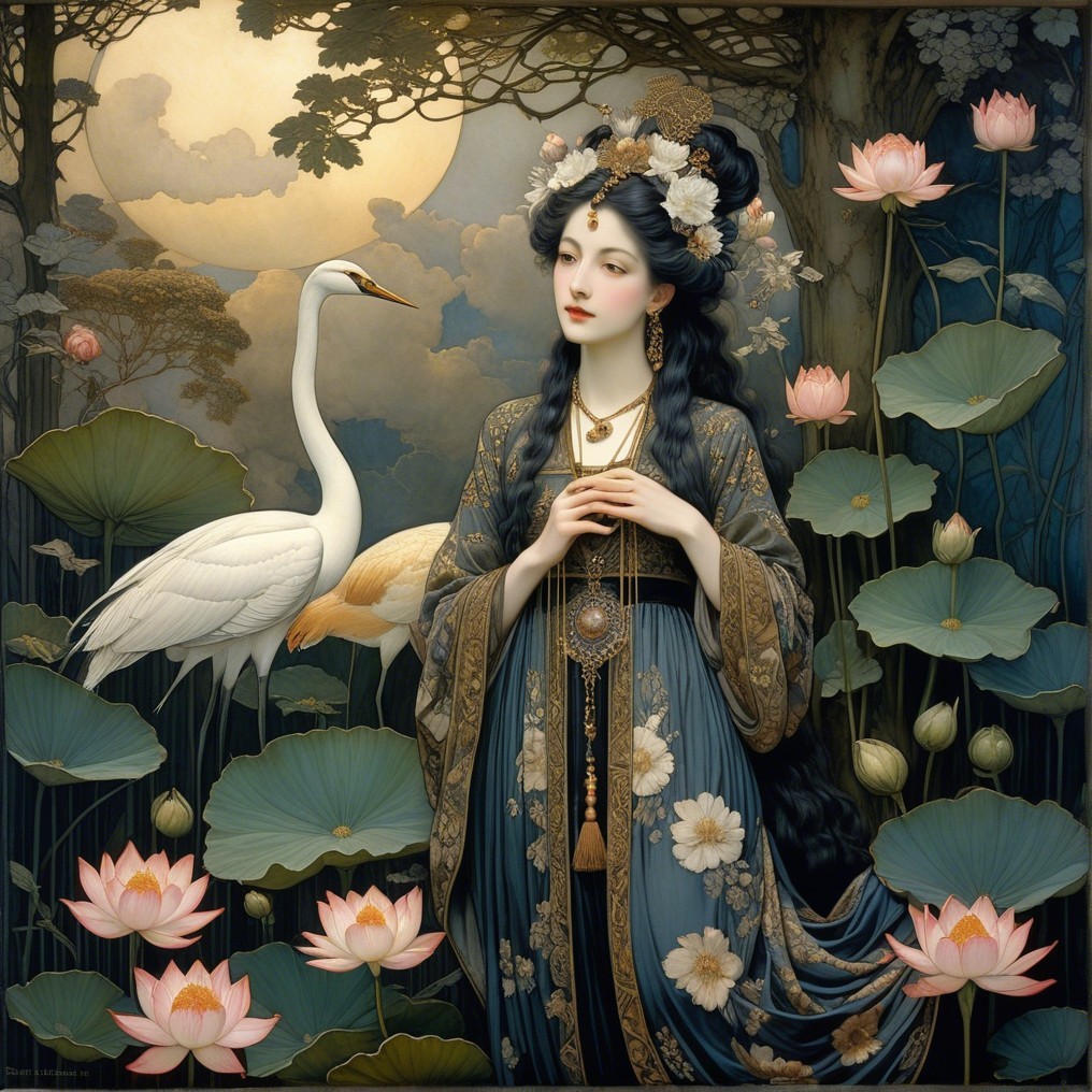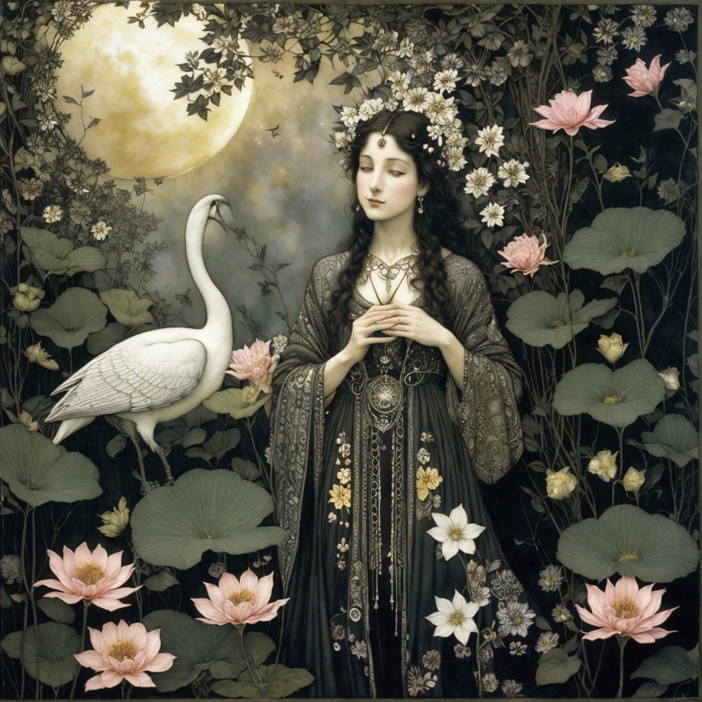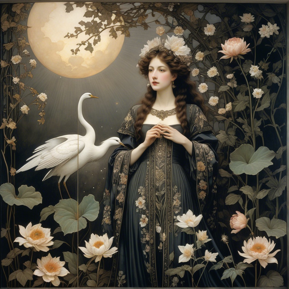 A serene woman with flowing hair adorned with flowers stands amid elegant blooms under a glowing moon. Her dark gown contrasts beautifully with the delicate colors of the flowers surrounding her.