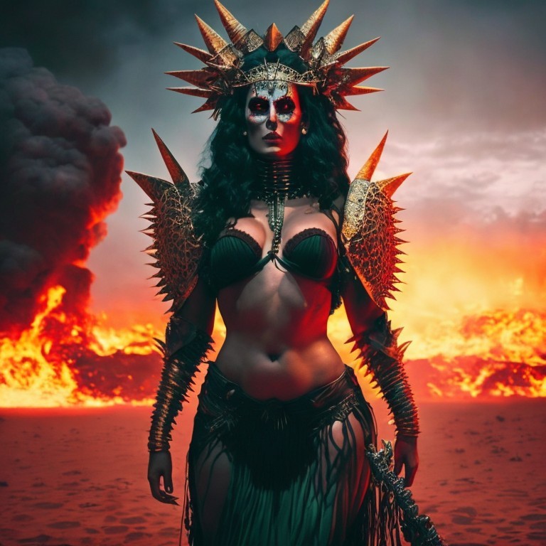 A woman in futuristic armor with a glowing crown stands before a dystopian cityscape at sunset.