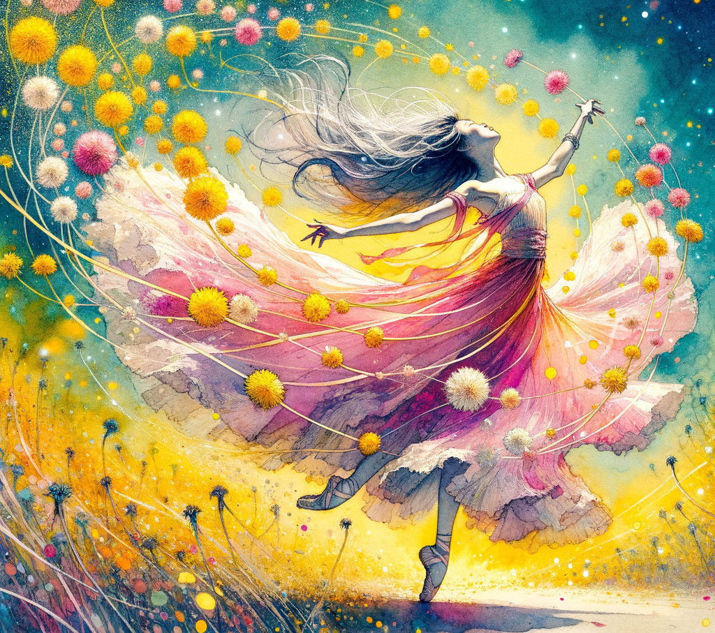 Vibrant image of a joyful woman dancing ballet in the wind, surrounded by floating flowers. Her flowing skirt and hair add to the ethereal atmosphere of the scene, painted in a palette of enchanting colors.