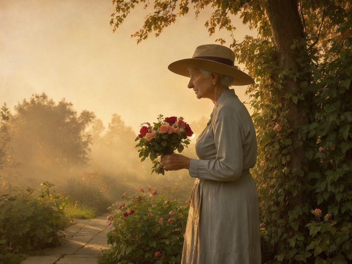 A full body shot of an elderly woman, with white hair in a bun, wearing a brimmed straw hat with a dark brown ribbon, and a long-sleeved light gray dress, holding a bouquet of red and pink roses, with her left arm bent at the elbow. She has wrinkles on