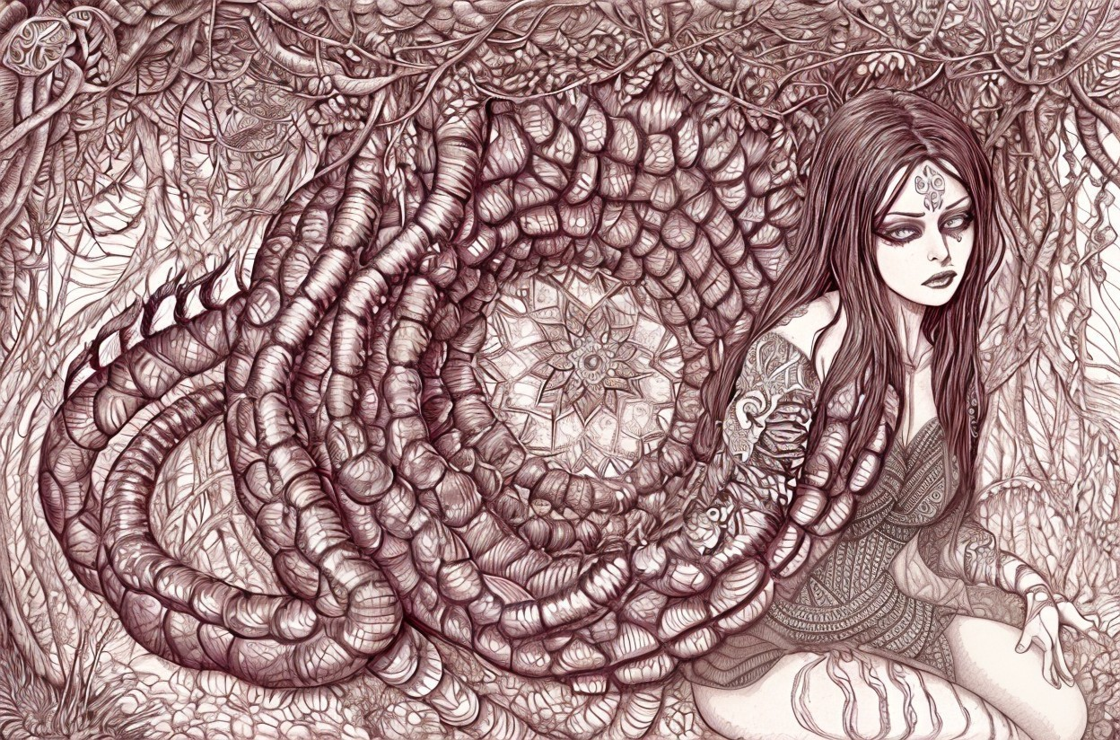 A monochrome illustration of a woman with elaborate markings, sitting next to a spiral of intricate patterns, possibly symbolizing a serpent.