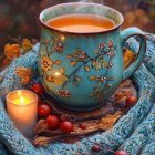 Floral Mug in Cozy Autumn Setting with Candles