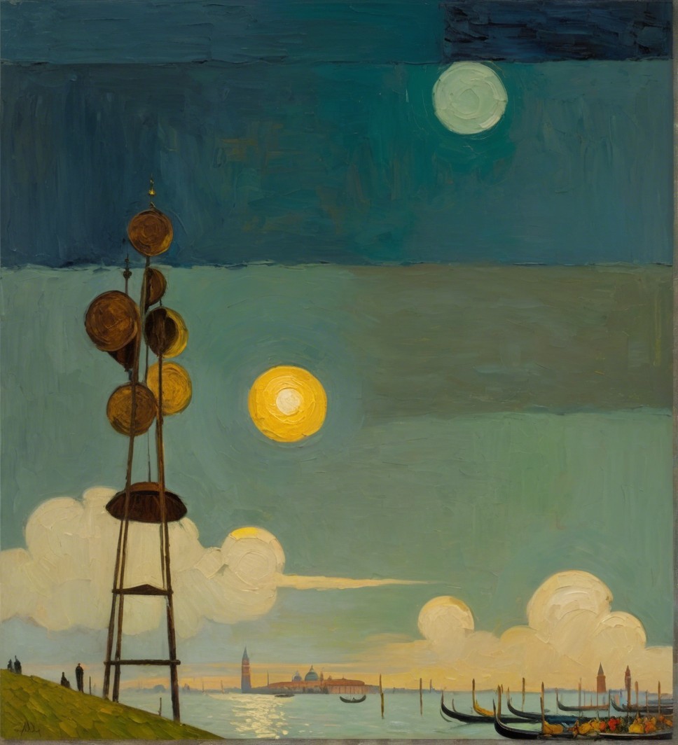 A stylish figure in a vintage-inspired dress stands by the water, gazing at two glowing moons. The skyline features distant buildings under a starry night sky, enhancing the dreamlike atmosphere.