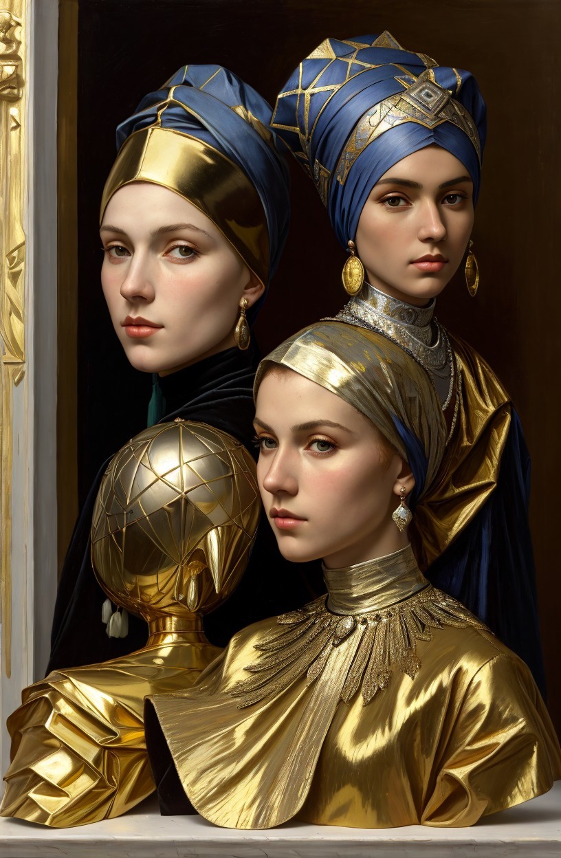 A painting of three women with elaborate headscarves and elegant attire, their poised expressions framed by a golden border.