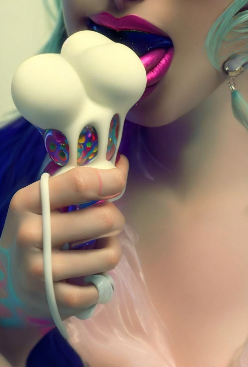 Surreal image of person with metallic purple lips and jewelry holding melting popsicle with colorful jewels