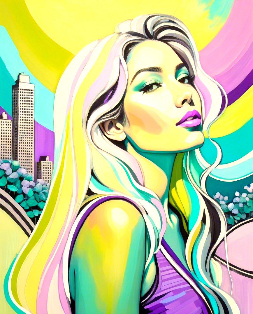 The image features a vibrant, stylized portrait of a woman with flowing hair and bold, colorful lines. A city skyline and abstract shapes create an energetic background.