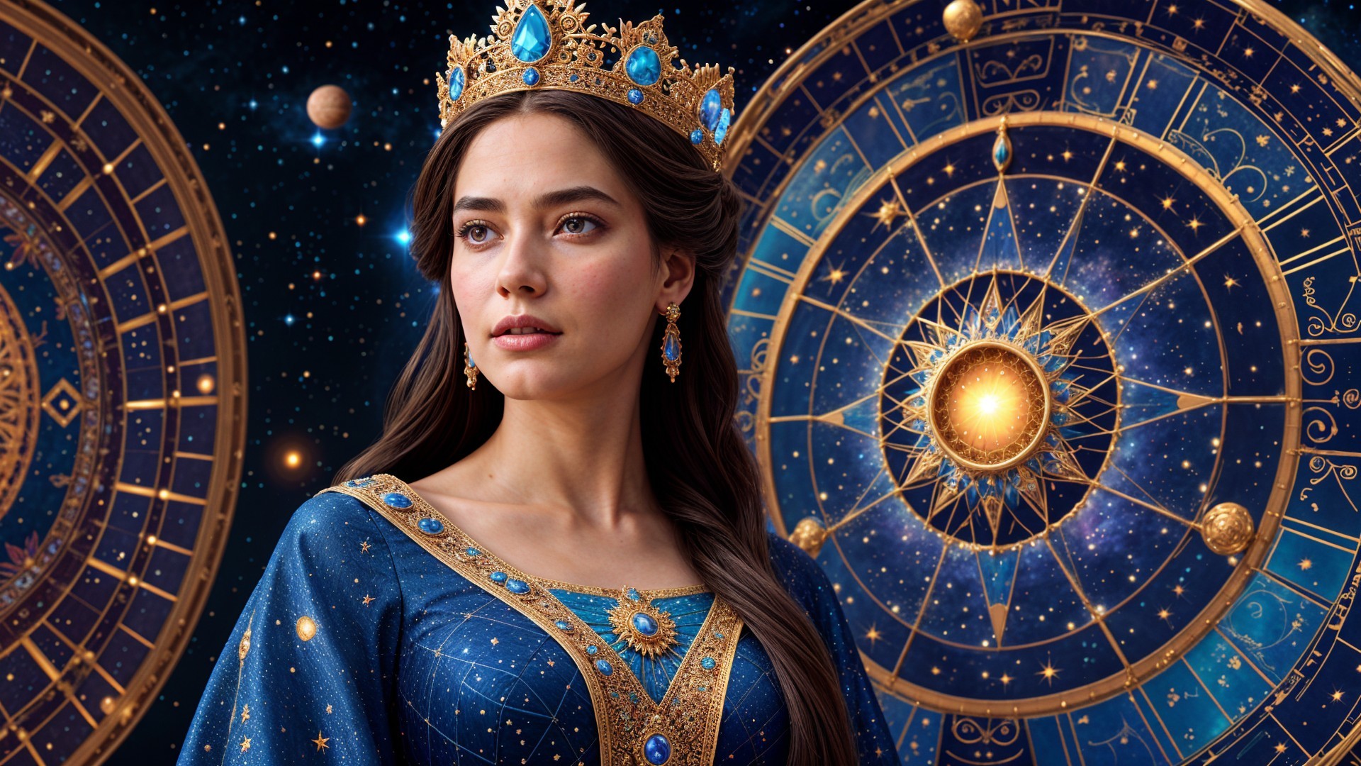 A regal woman adorned in a blue gown and intricate jewelry stands against a cosmic backdrop with vibrant celestial designs, evoking a sense of mystique and grandeur.