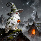 A whimsical scene featuring a smiling, plump woman in a patterned dress and a pointed hat, holding a martini glass. She stands beside a golden pot, with a moon face and flowers in a dreamy background.