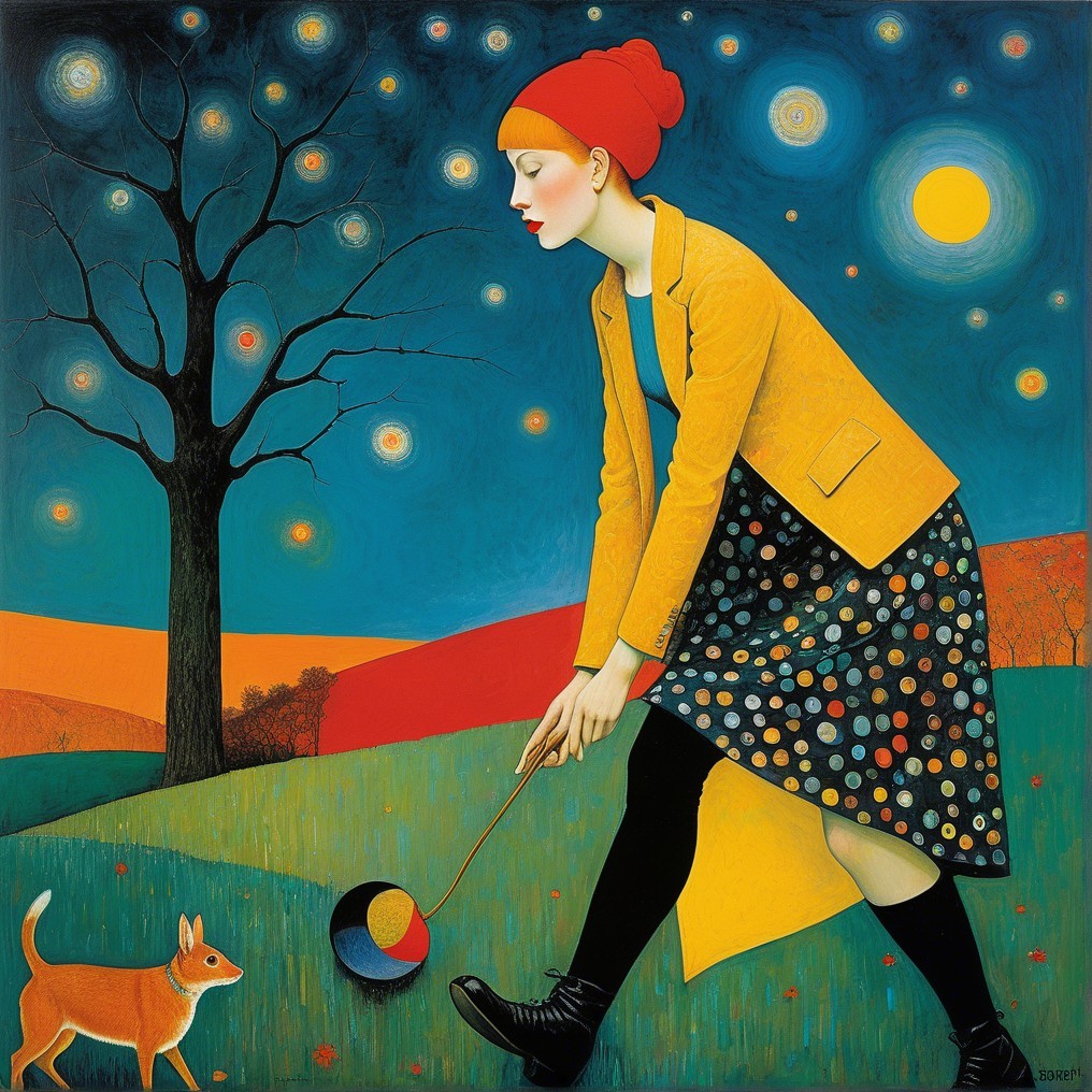 A whimsical illustration of a woman in a yellow coat and red hat walking a colorful ball on a leash, accompanied by a small dog, against a vibrant night sky with stars and a tree.