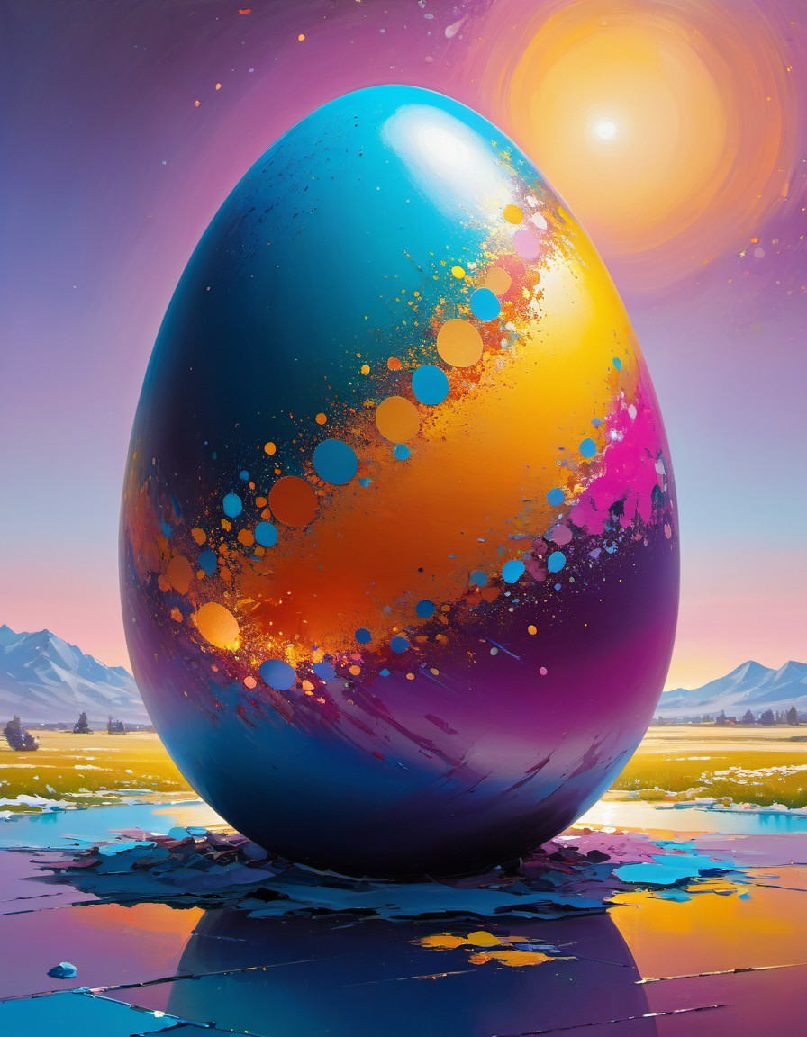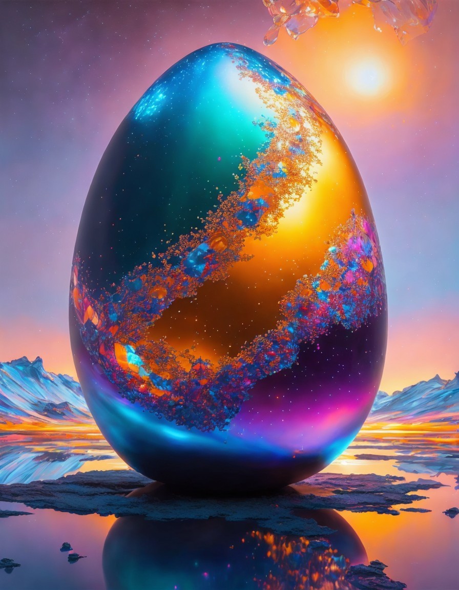 A vibrant cosmic egg with swirling galaxy patterns, reflecting on a surface against a backdrop of a surreal, colorful sky and suns.