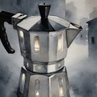 Whimsical Watercolor of Moka Pot in Urban Setting