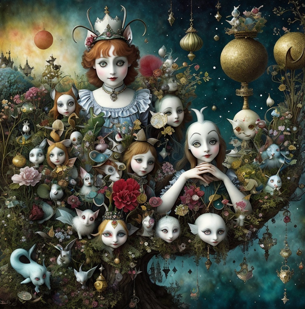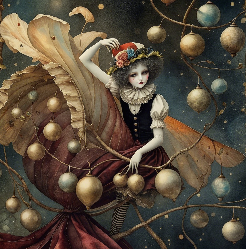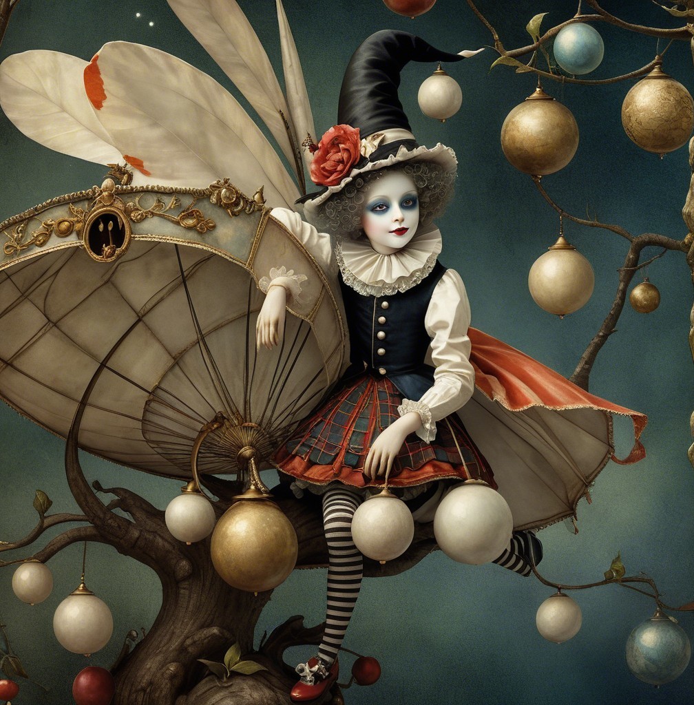 Close up, adorable Pierrot creature mythological world of Alice and wonderland, in the style of Alexander Jansson. by Catrin Welz-Stein, Michael Parkes