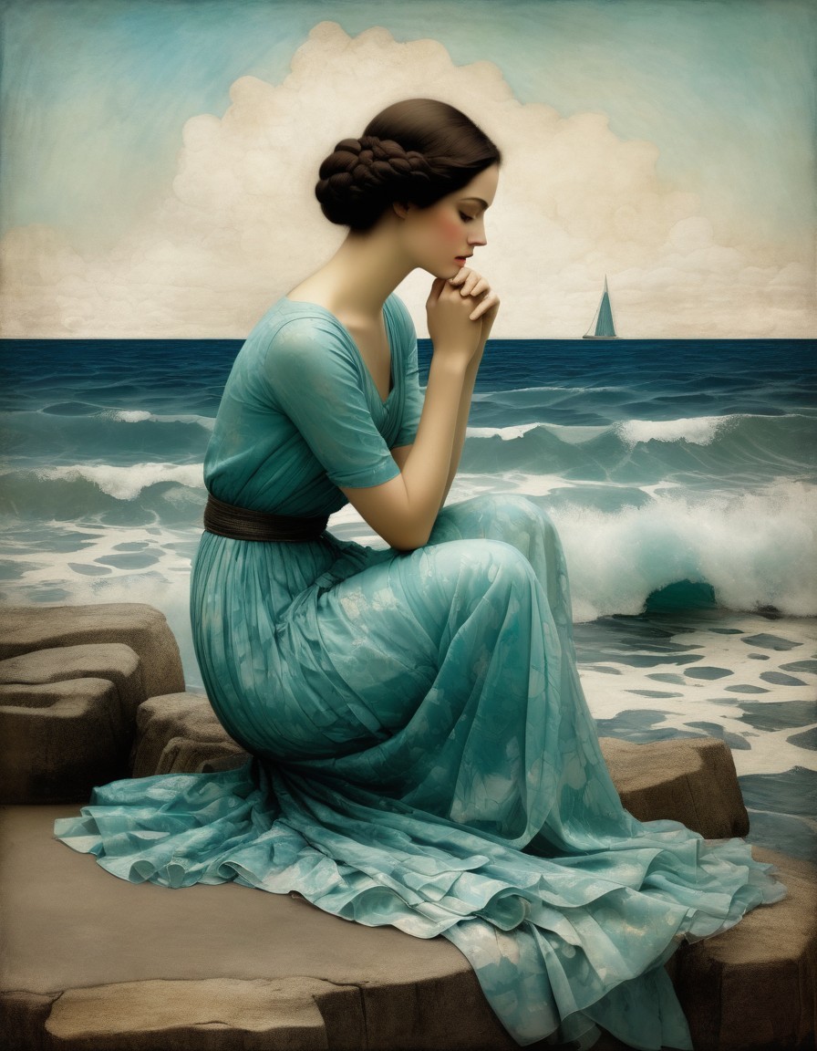 A contemplative woman in a flowing blue dress sits on coastal rocks, gazing at the sea with a distant sailboat on the horizon.