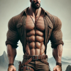 The image features a muscular man with exaggerated biceps and a chiseled physique, wearing a rugged shirt and belt, set against a scenic mountainous backdrop.