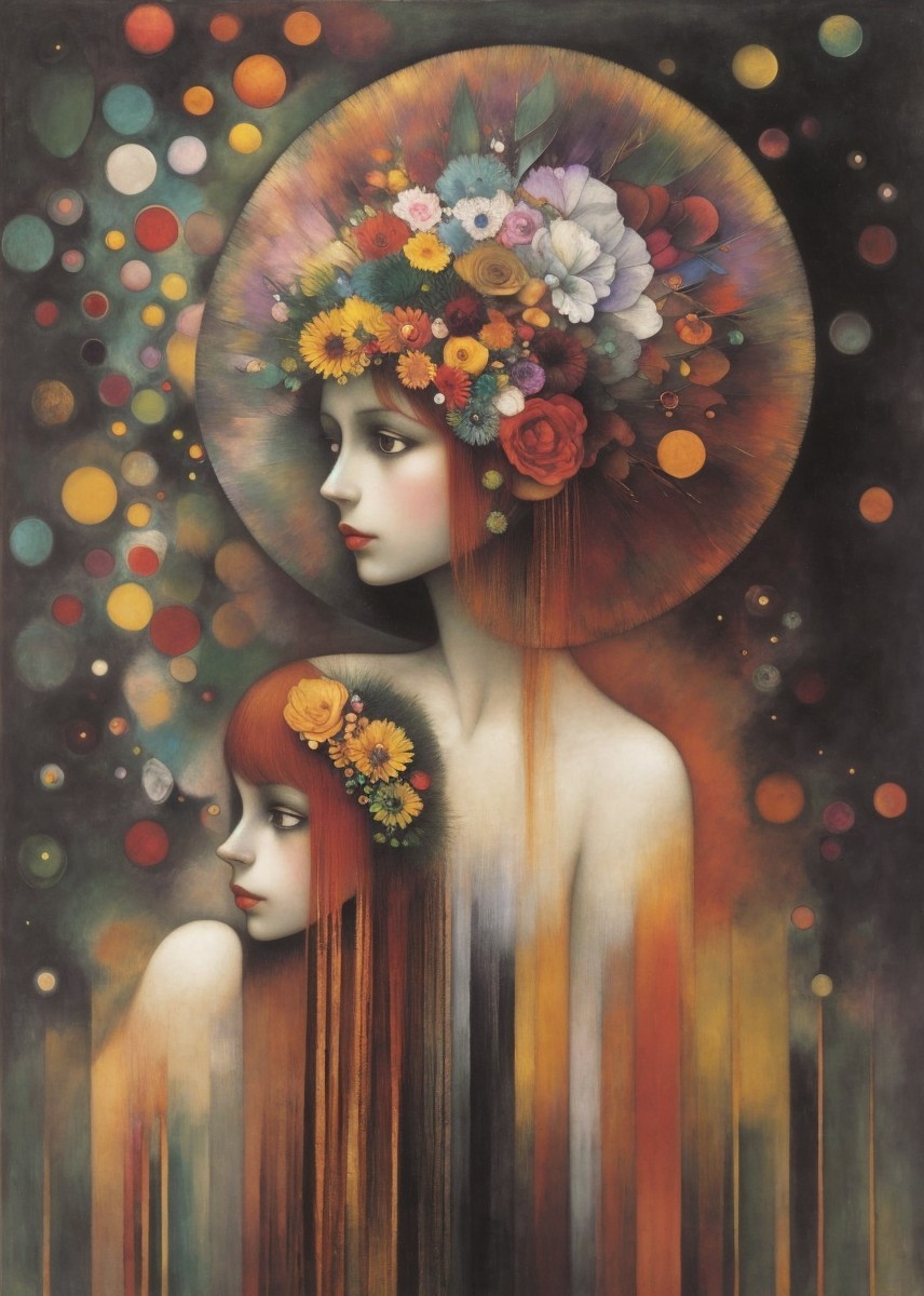 A woman with a geometric-patterned halo holds a red apple, with a muted color palette and abstract elements.