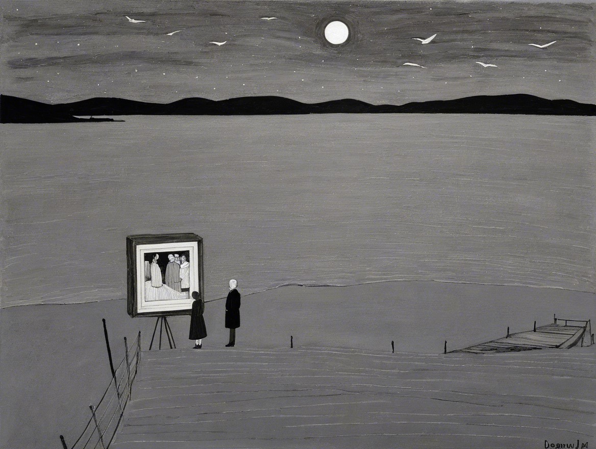 Monochromatic Scene of Figures by a Dock at Night