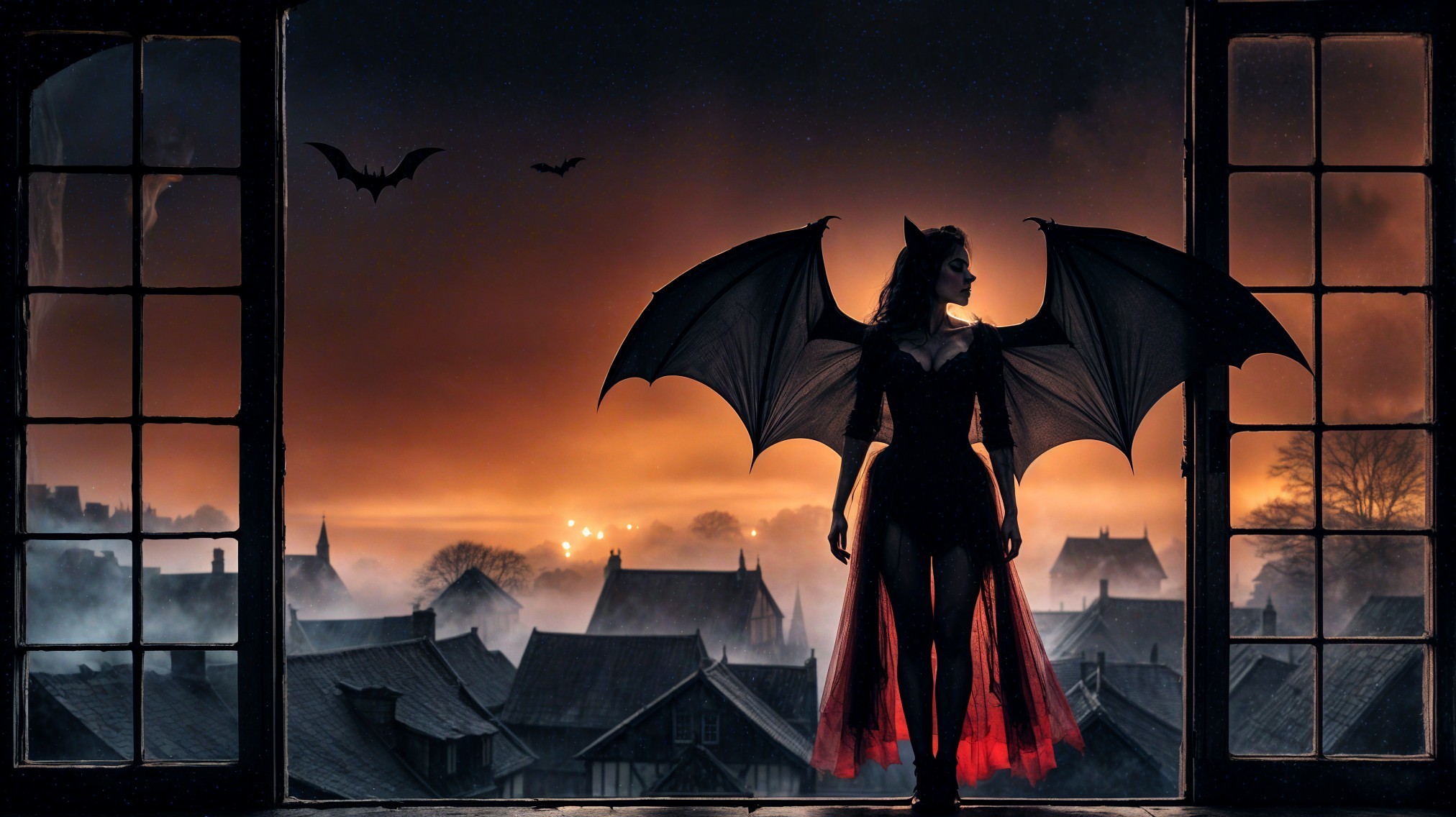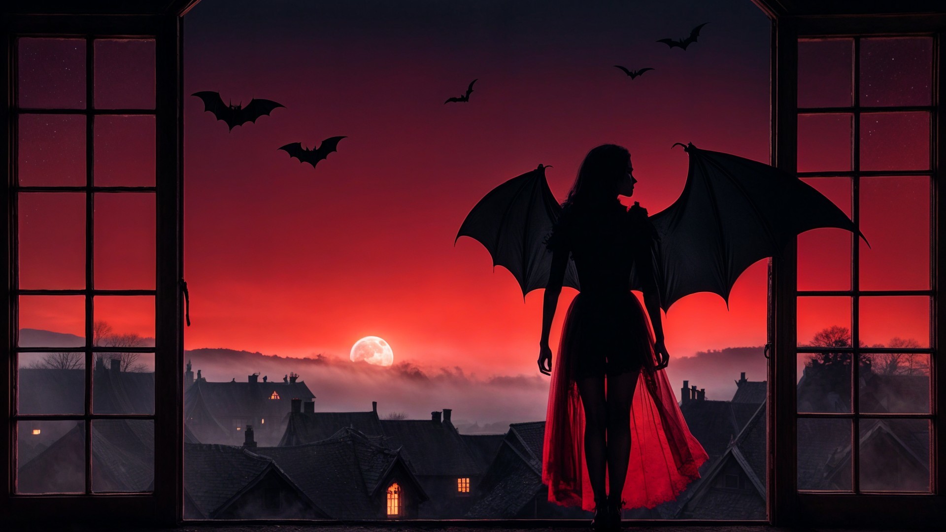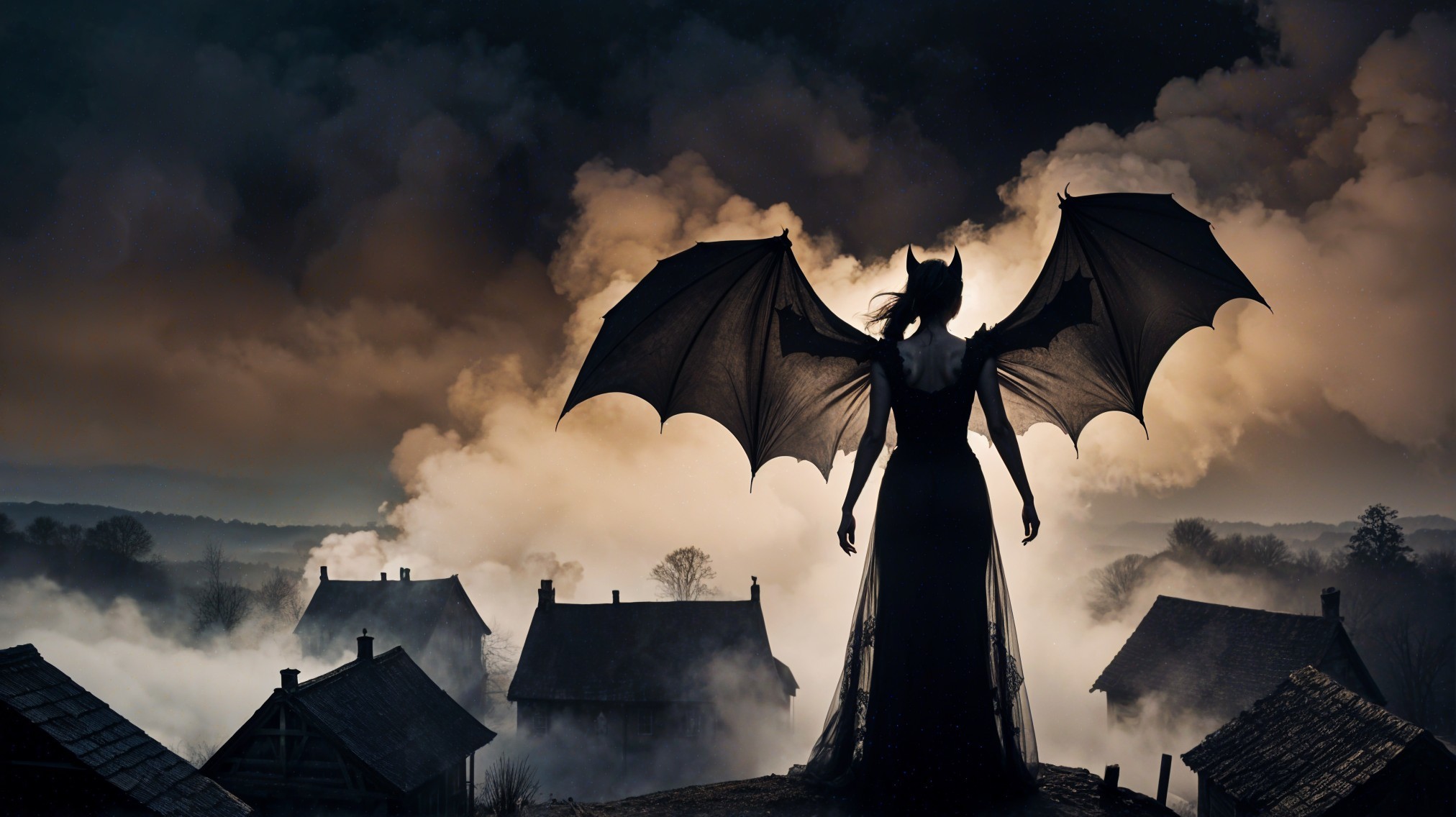 A silhouette of a mysterious woman with bat-like wings stands against a blood-red moon, shrouded in mist. Bats fly in the twilight sky above a shadowy village, creating an eerie atmosphere.