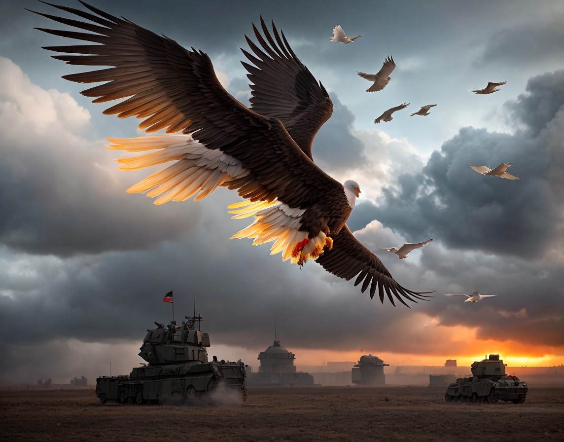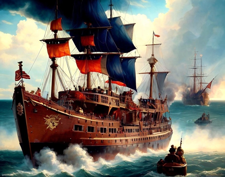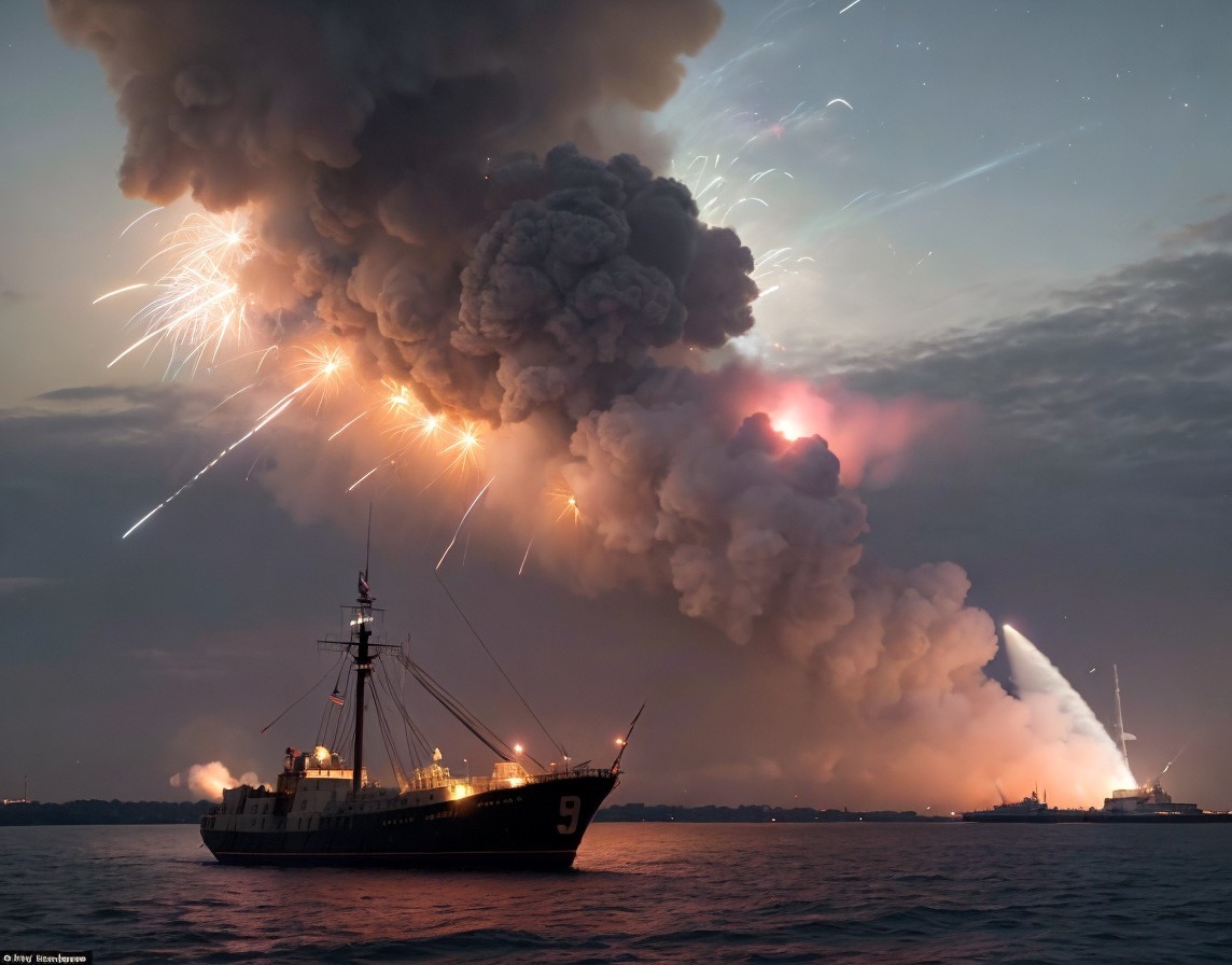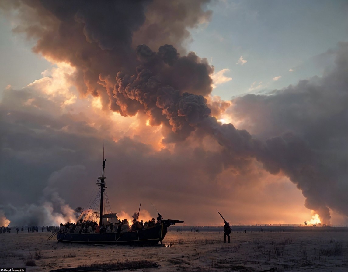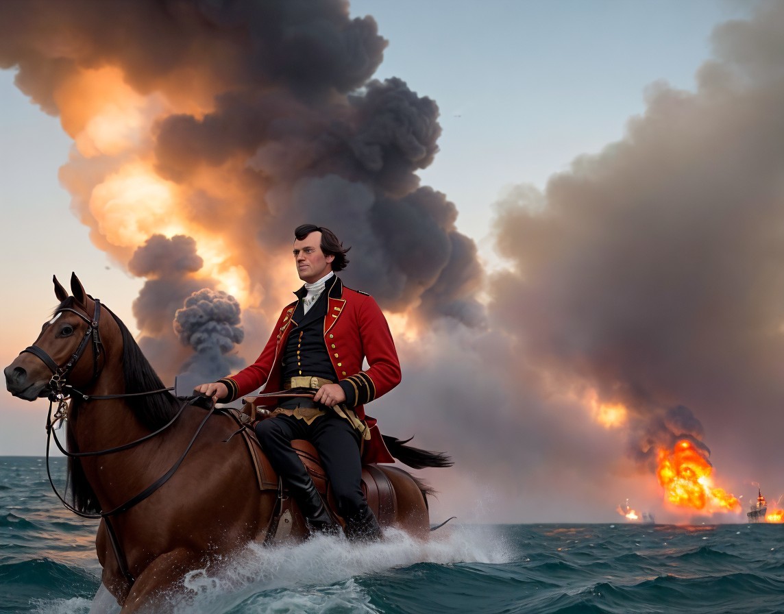 A person in historical military attire observes a vast volcanic eruption with fiery lava and billowing smoke against a dramatic sky.
