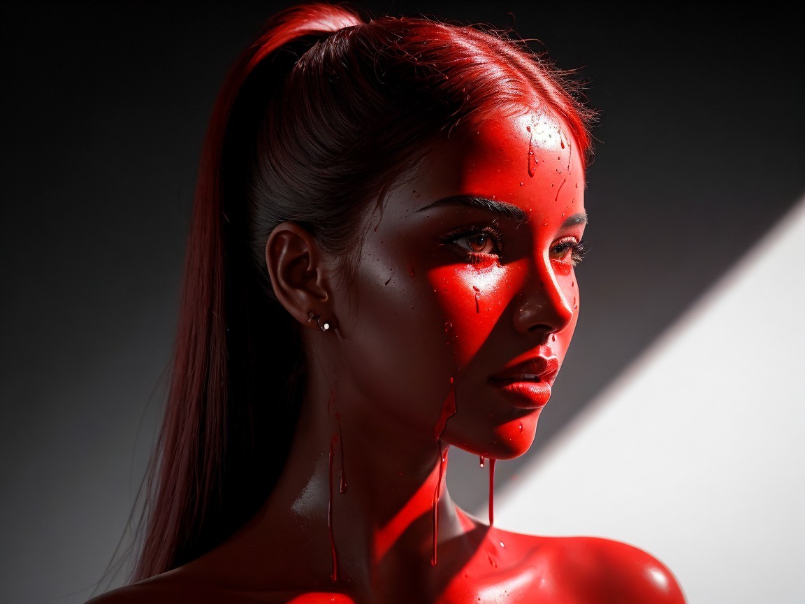 A striking portrait of a young woman with long hair pulled back, highlighted by dramatic red lighting. Glossy droplets run down her face, creating a captivating blend of beauty and intensity.