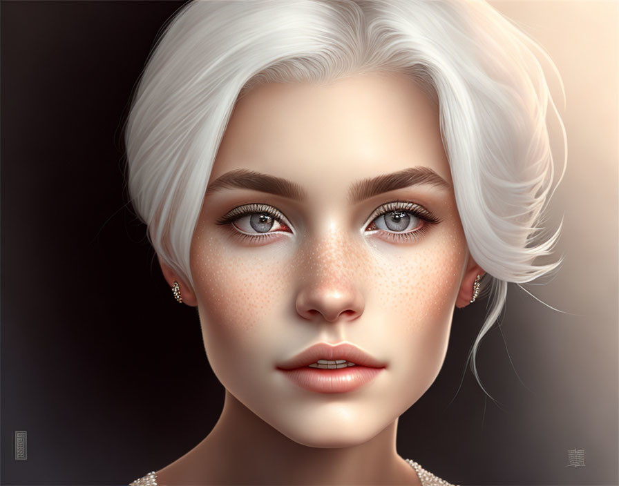 Prompt: cute woman with choppy white blonde hair that falls around her shoulders with big gray eyes, full lips, pale skin, freckles, and impish face, a tiny body