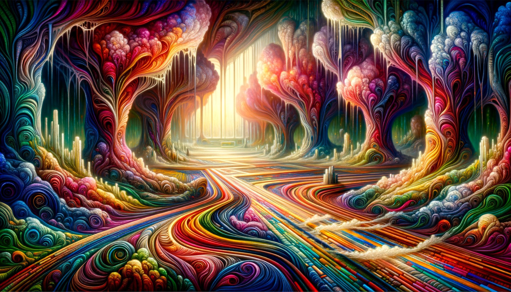 A vibrant, colorful cityscape with fiery skies and bustling roads, depicted in a vivid, artistic style.