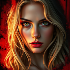 A close-up portrait of a woman with striking green eyes and glossy red lips. Her long, flowing blonde hair frames her face, illuminated against a backdrop of soft red bokeh lights.