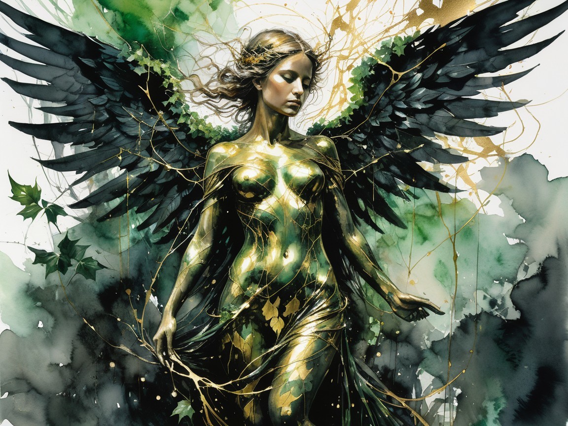 A mystical figure with golden skin and large, dark wings stands gracefully amidst swirling greens and golds. Ivy clings to her form, evoking a fusion of nature and ethereal beauty.