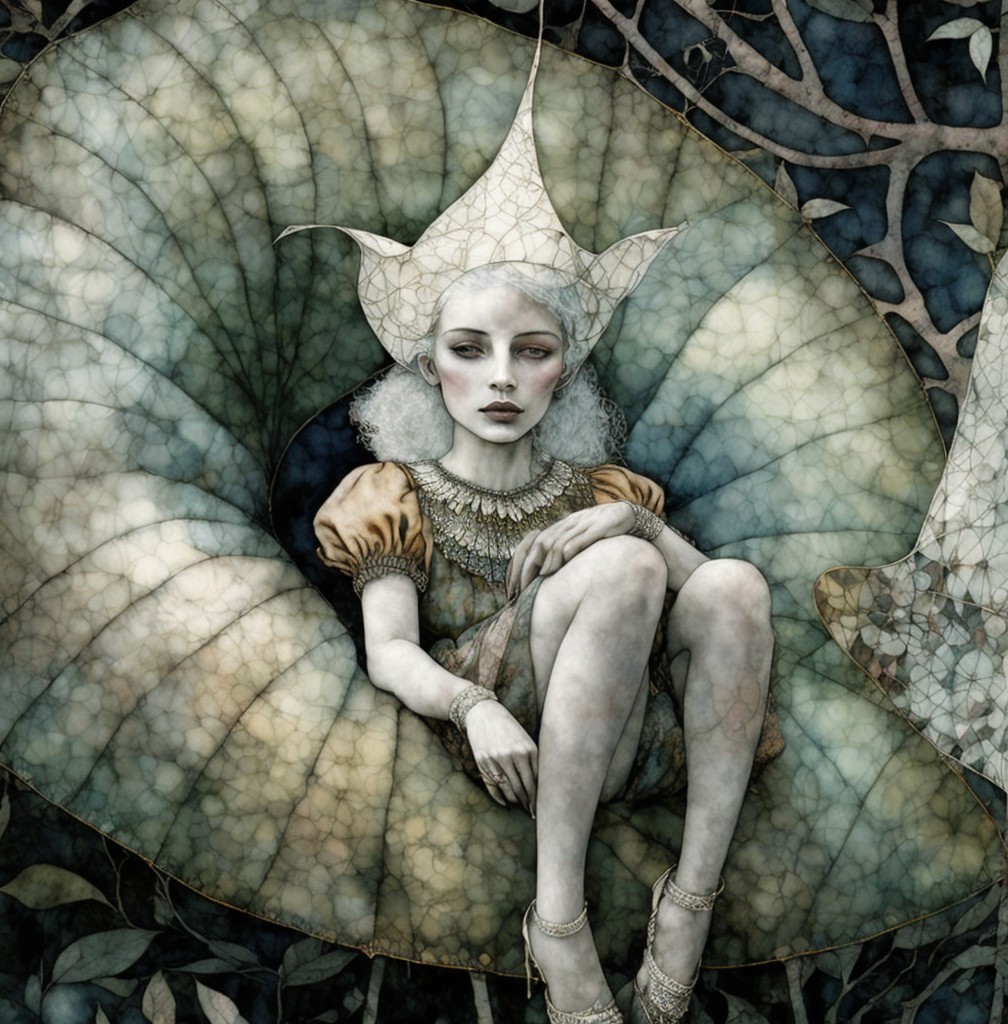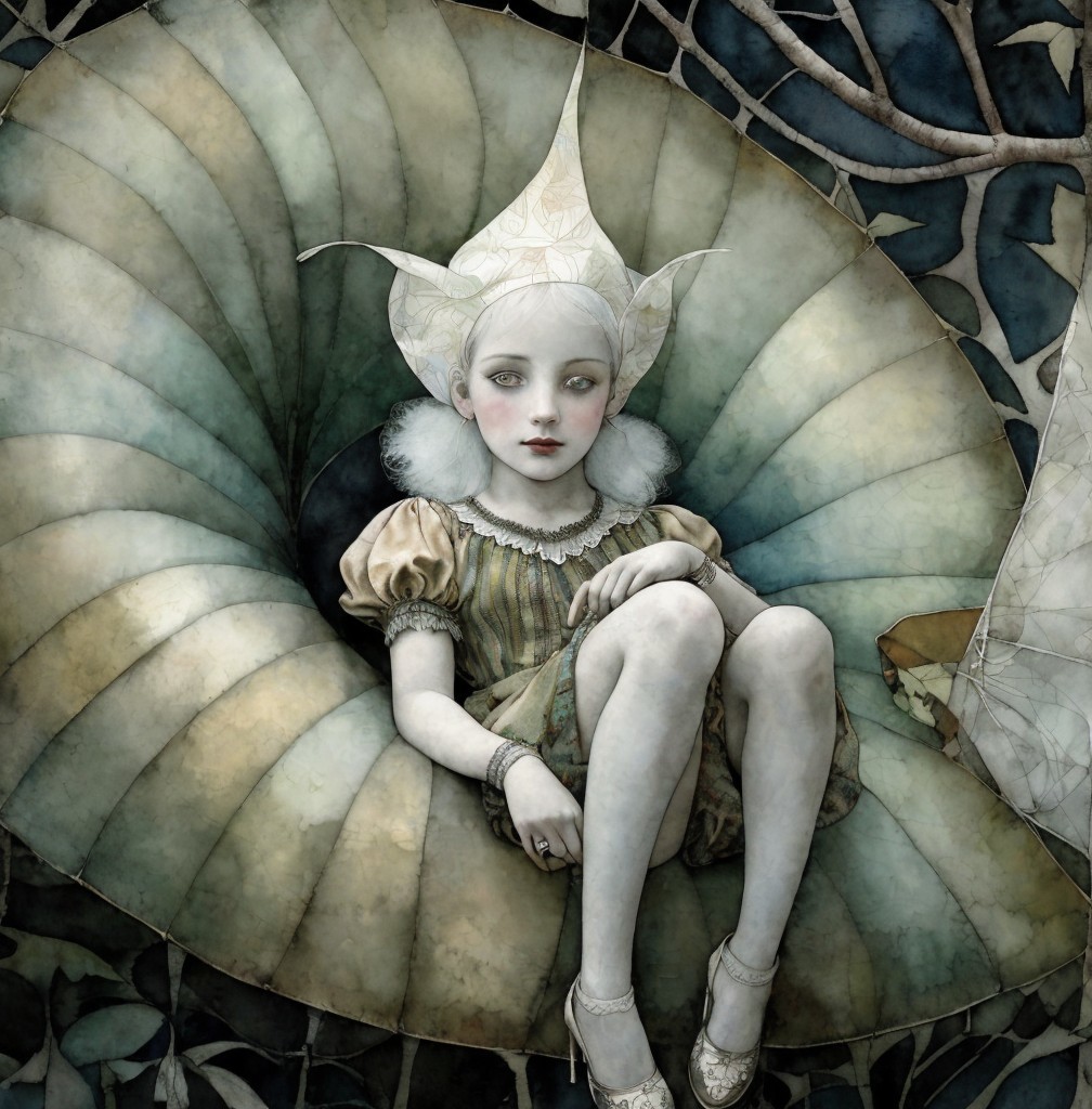 A girl with a porcelain complexion and silver hair sits gracefully in a spiral, mosaic-patterned shell. She wears a vintage dress with puffed sleeves and a delicate crown, exuding an ethereal aura.