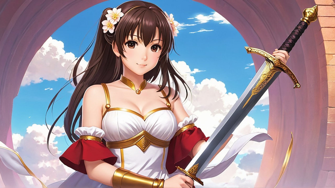 A charming anime goddess stands gracefully, her enchanting features framed by flowing hair. Clad in elegant attire, she wields a shimmering sword, exuding strength and beauty in a captivating pose.
