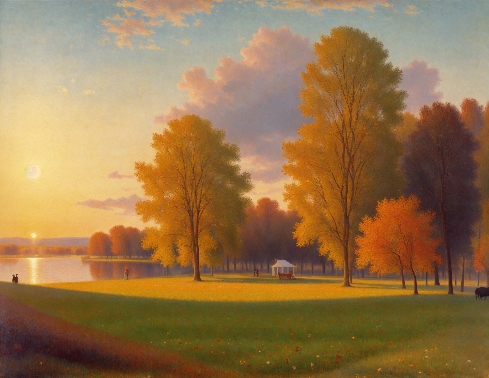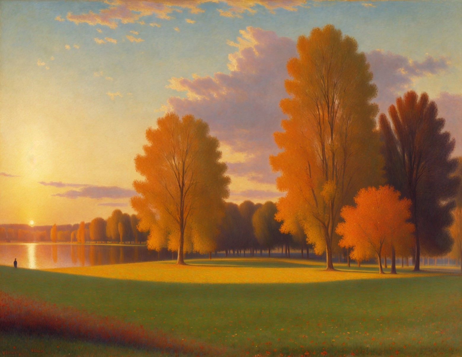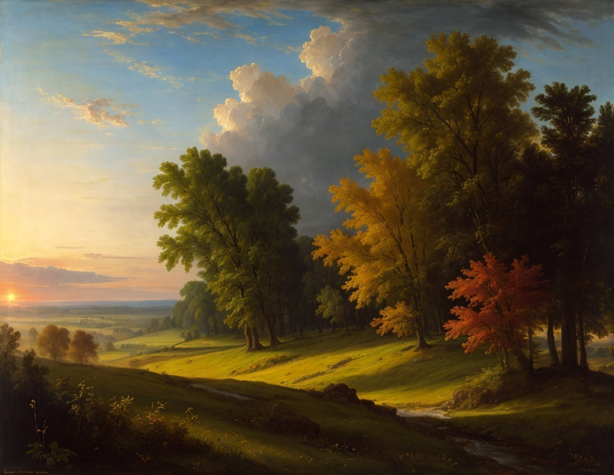Prompt: "Oil on canvas, wide angle landscape view, a wonderful sunrise. Glowing with vibrant hues. Perfect composition. By Peter Paul Rubens. William Turner. By Pierre-Auguste Cot."
