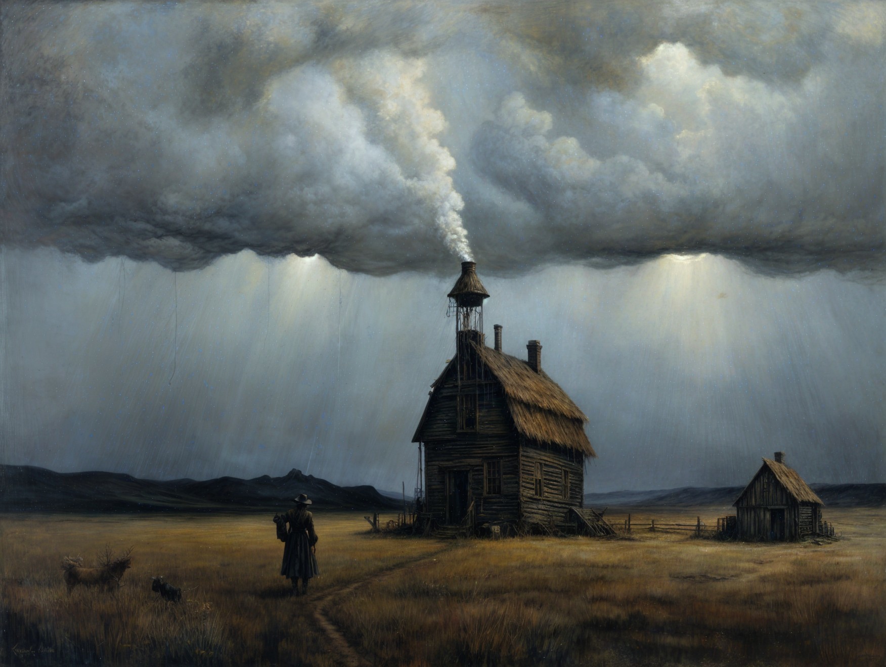 A serene watercolor depicts a rustic house under a starlit sky, surrounded by softly glowing homes. The moon casts a gentle light on the tranquil landscape, evoking a sense of calm solitude.