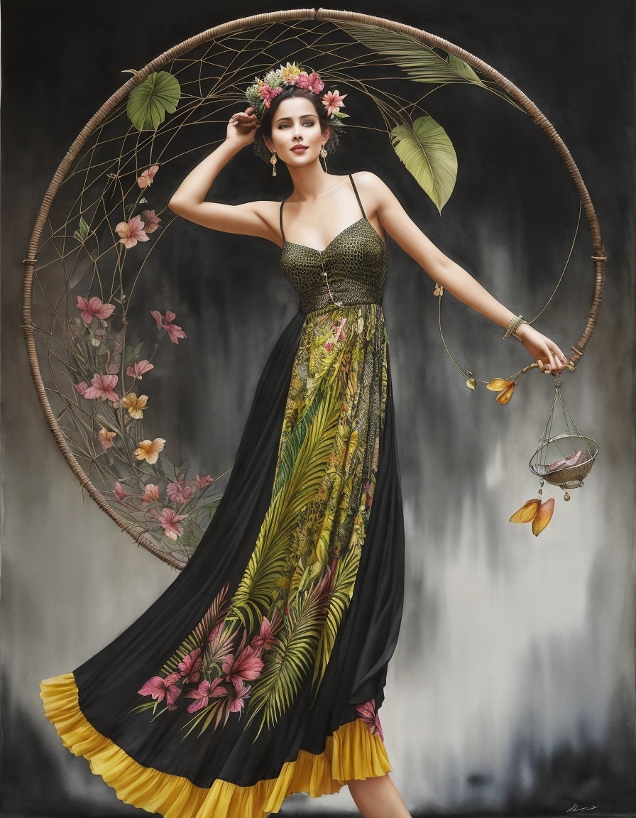 A woman in an elegant, flowing dress holds an umbrella and a string of beads, standing against a mystical backdrop with rocky formations.