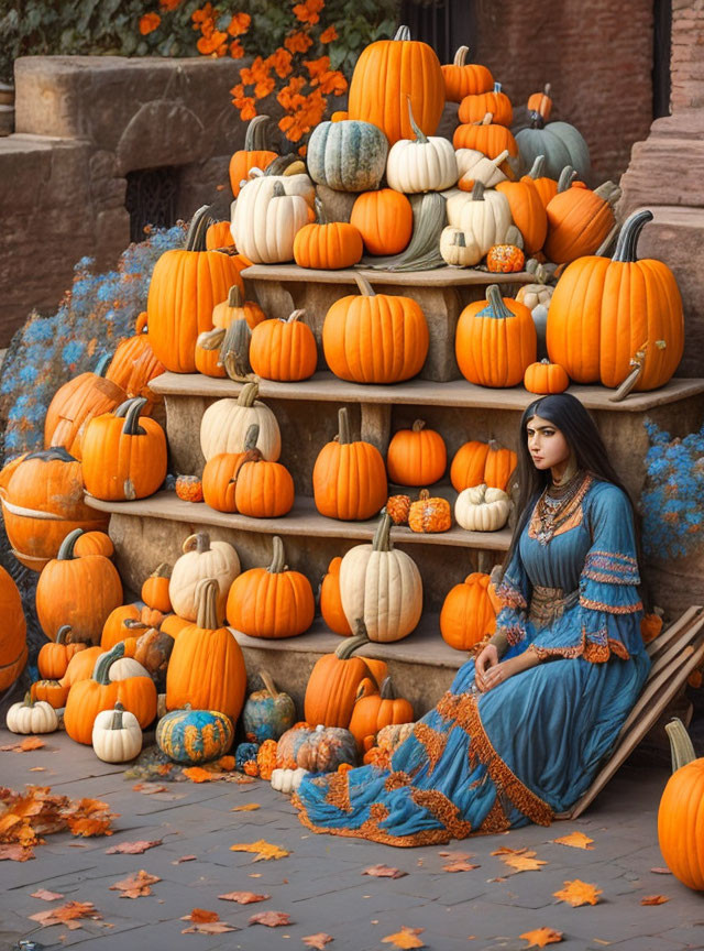 The beautiful shopkeeper with a magnificent visage remains solitary and resplendent, adorned in exquisite blue high heels, standing before her pyramid of pumpkins, all while maintaining the enchanting style reminiscent of John William Waterhouse