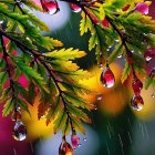 A vibrant watercolor scene captures autumn's beauty with colorful leaves and tranquil water. Four wooden boats hang gently from branches, while soft rain adds a serene atmosphere.
