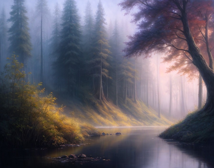 A serene, misty landscape with a gentle river, surrounded by trees with hints of autumn colors under a soft, glowing light.