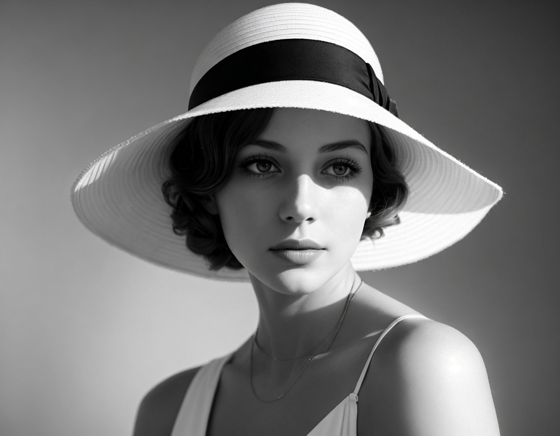 A black and white image of a woman with a classic wide-brimmed hat, exuding vintage elegance.
