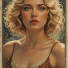 The image features a vintage-style poster of a woman with curly blonde hair, captivating eyes, and a serene expression, set against a dramatic cloudy backdrop. The design evokes a classic aesthetic.