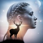 A serene profile of a woman with a braided hairstyle, set against a surreal landscape featuring a large moon, silhouettes of trees, and distant figures with animals, evoking a dreamlike atmosphere.