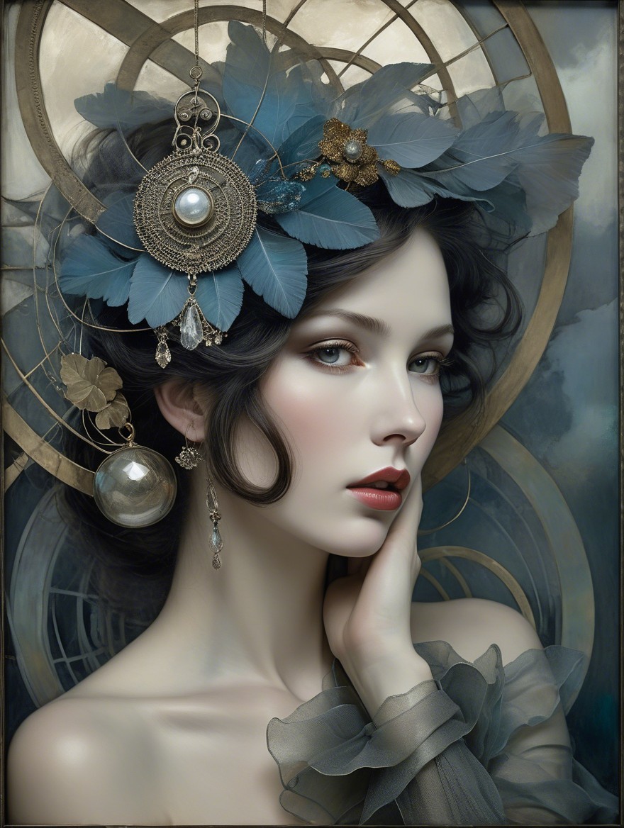 A beautifully rendered portrait of a woman with flowing hair adorned with leaves and pearls. Her expression is serene, framed by a soft, ethereal background that enhances her elegance.
