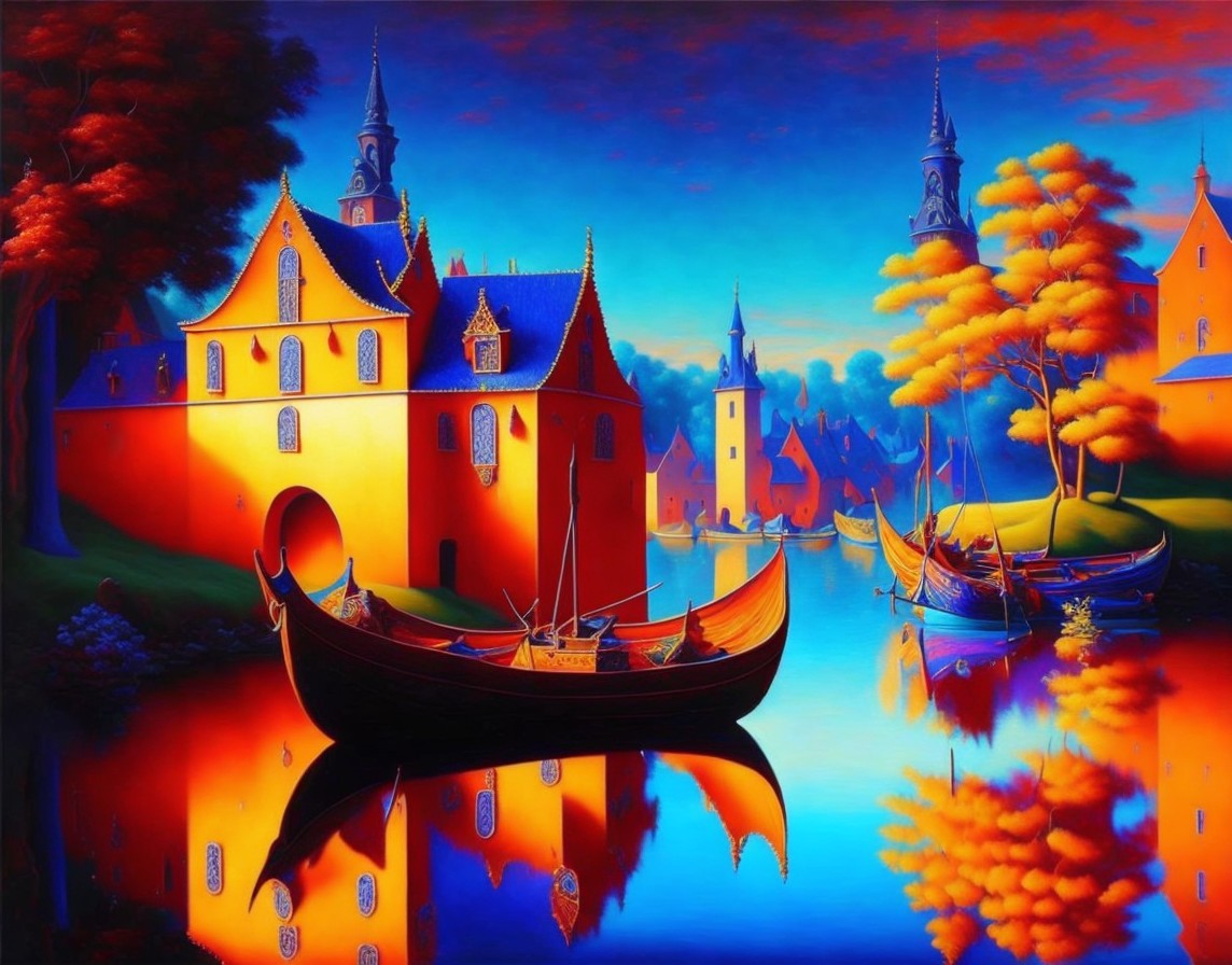 A vibrant scene featuring colorful buildings reflecting in calm waters, with boats gently floating. The sky is bright blue, illuminated by warm hues of orange and yellow, creating a serene atmosphere.
