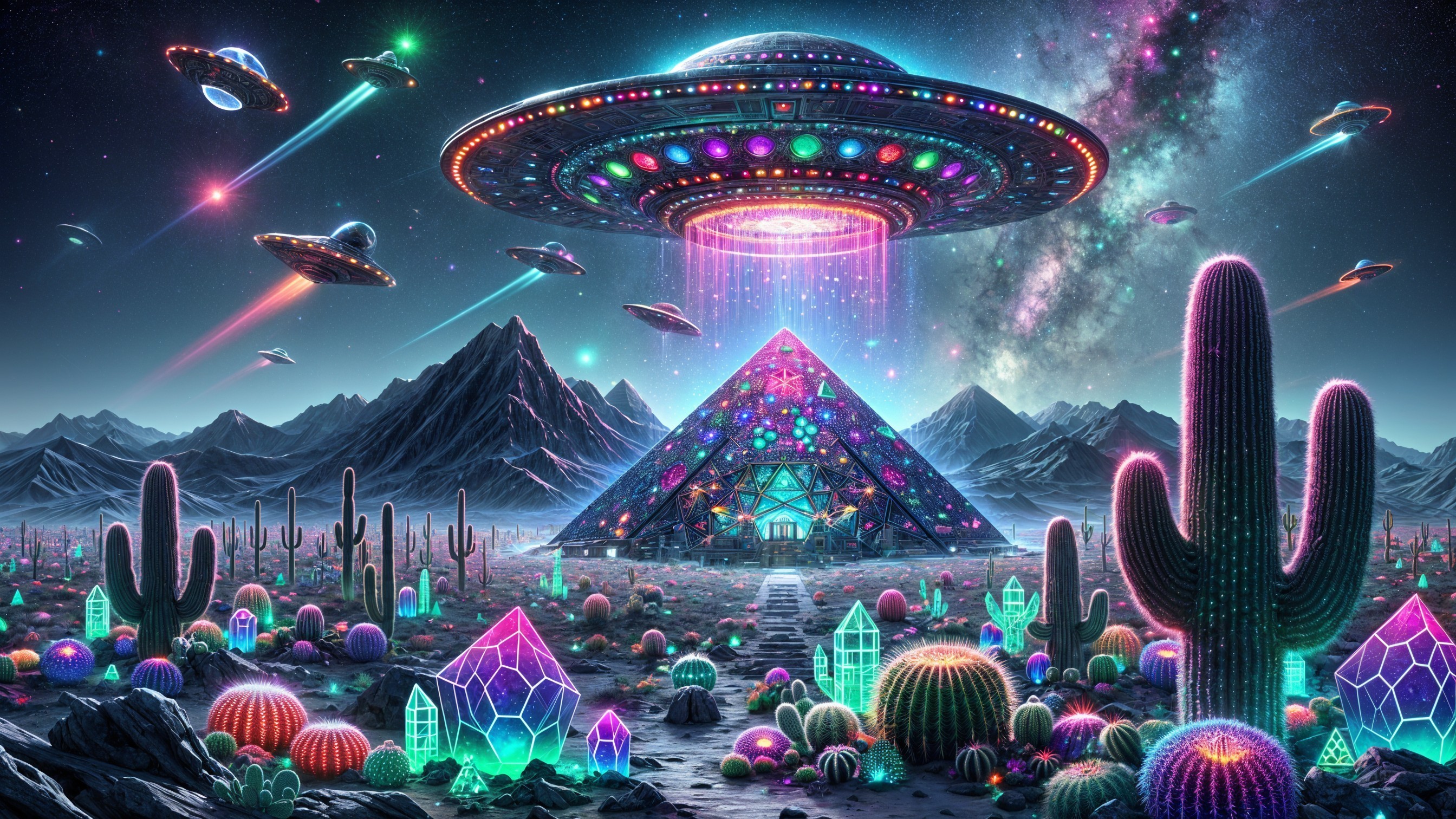 A futuristic scene features a glowing pyramid surrounded by vibrant cacti and colorful geometric shapes, with a hovering UFO illuminating the landscape beneath a starry sky and distant mountains.