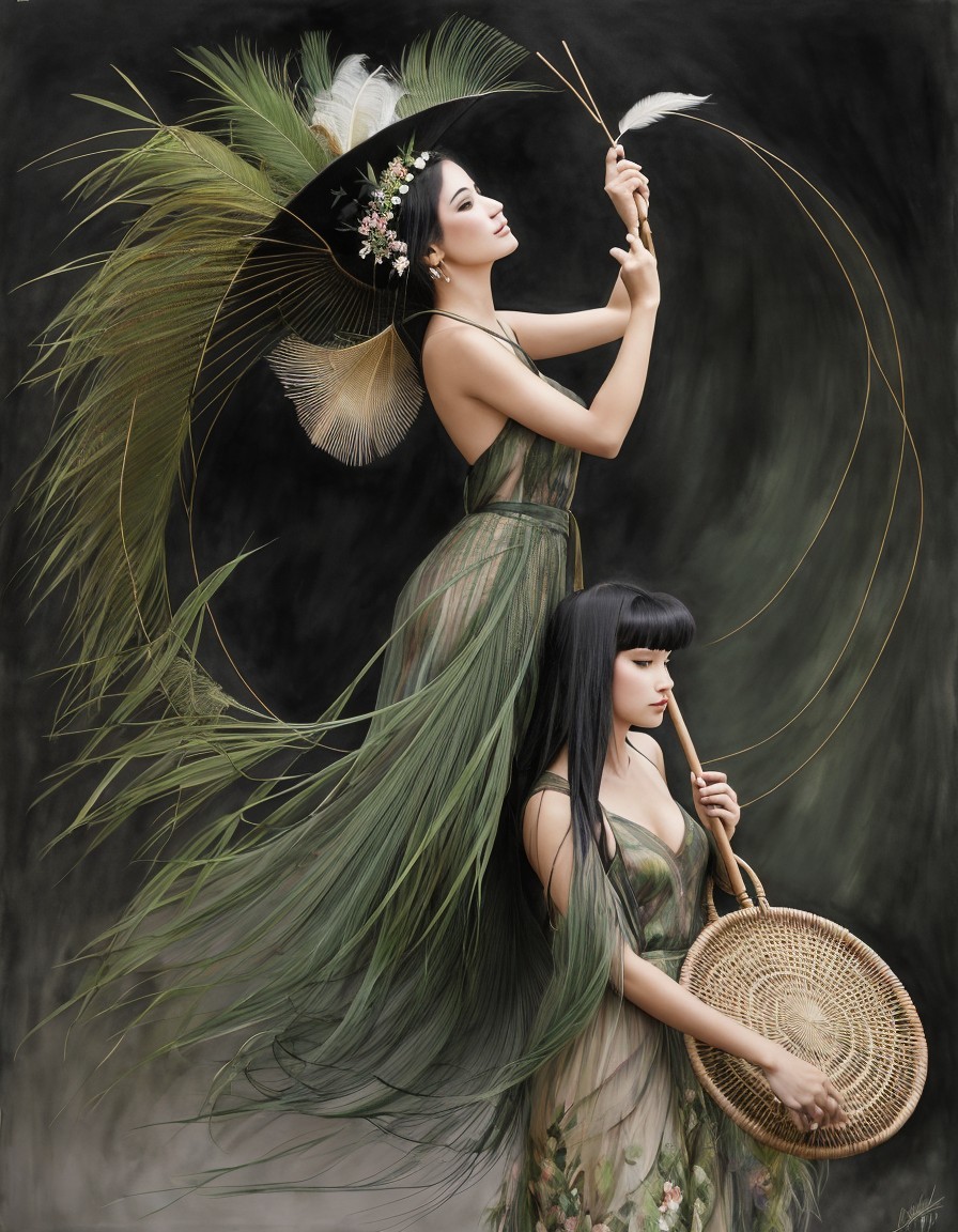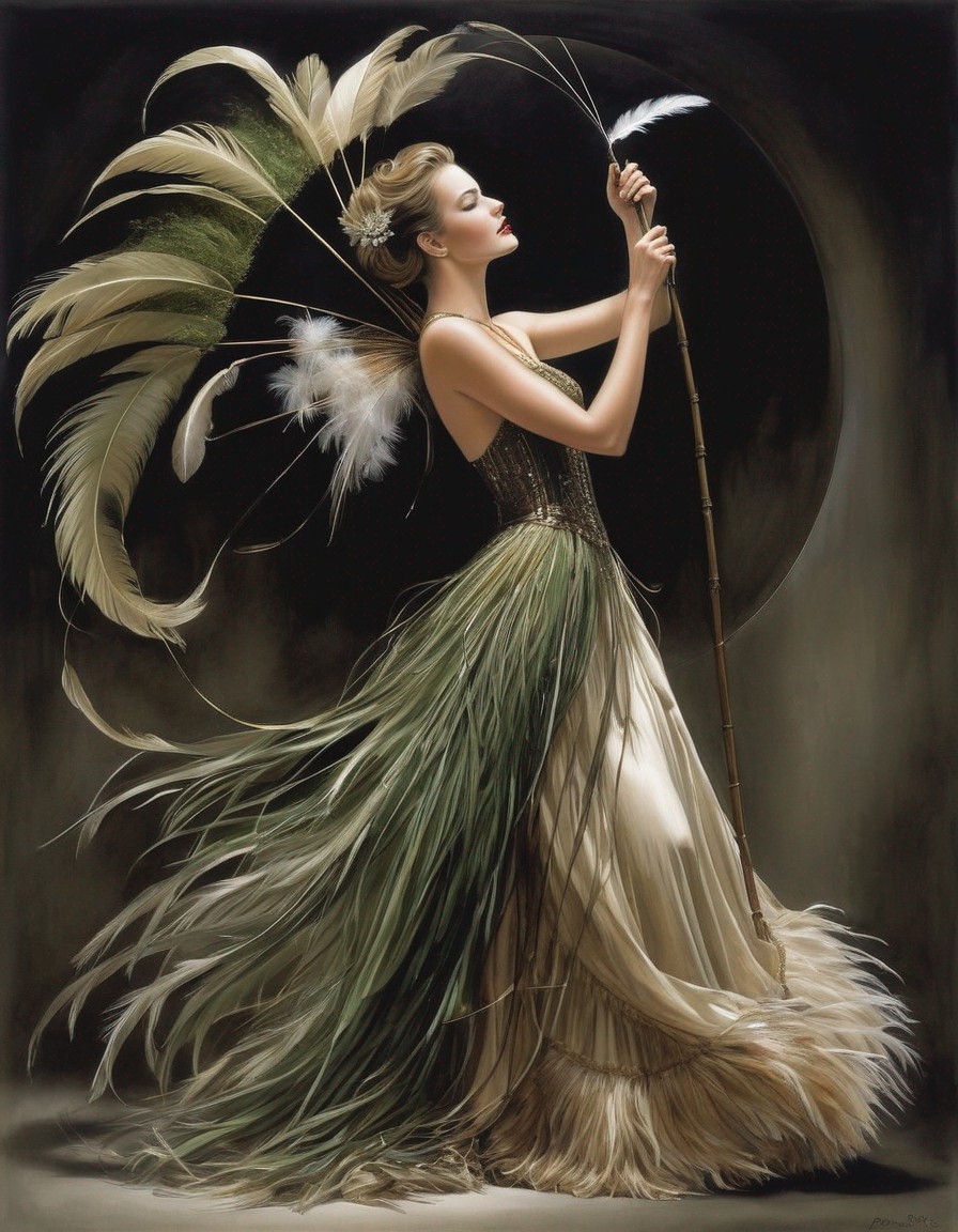 A woman in an elegant feathered dress and hat stands gracefully among tall grasses, holding a thin cane.
