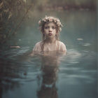 A serene scene of a young girl with a floral crown, partially submerged in a calm, reflective pond surrounded by lush, green foliage. The atmosphere is ethereal and dreamlike.
