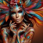 A striking portrait of a woman adorned with vibrant face paint and elaborate feather headpiece. Her colorful hands and bold makeup create a dramatic, artistic expression.