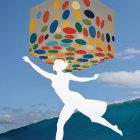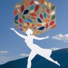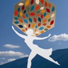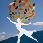 A striking silhouette of a dancer holds a large hexagonal shape adorned with colorful leaves against a backdrop of blue sky and mountains, symbolizing grace and nature’s beauty.