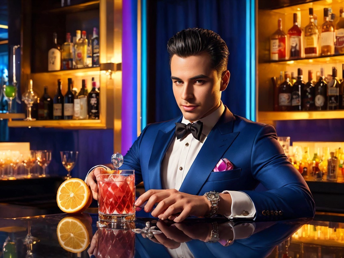 A stylish bartender in a blue tuxedo serves colorful cocktails at a vibrant bar, illuminated by soft lights. Shelves behind him are stocked with a variety of spirits and drinks.
